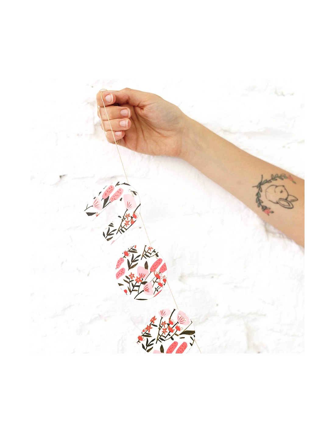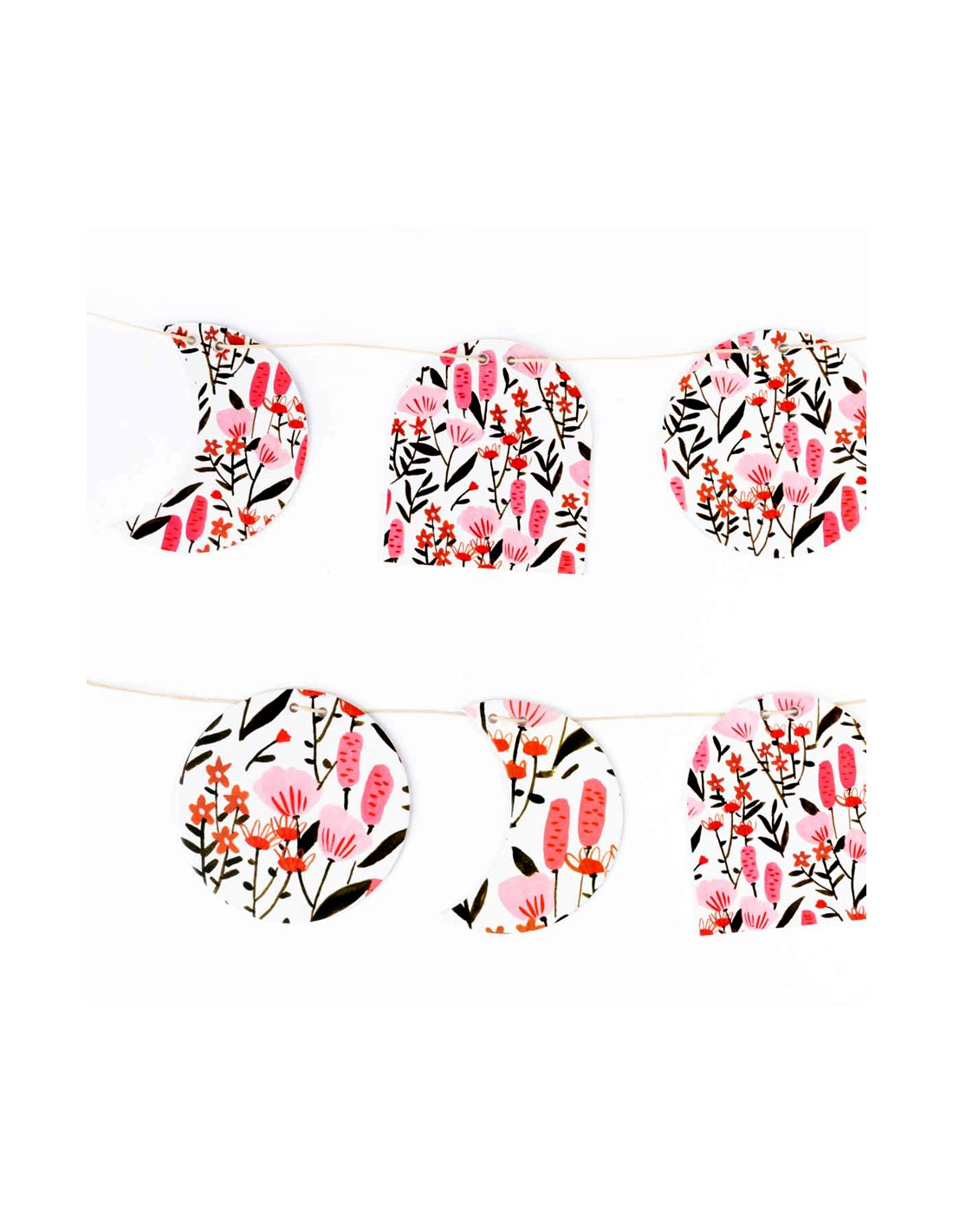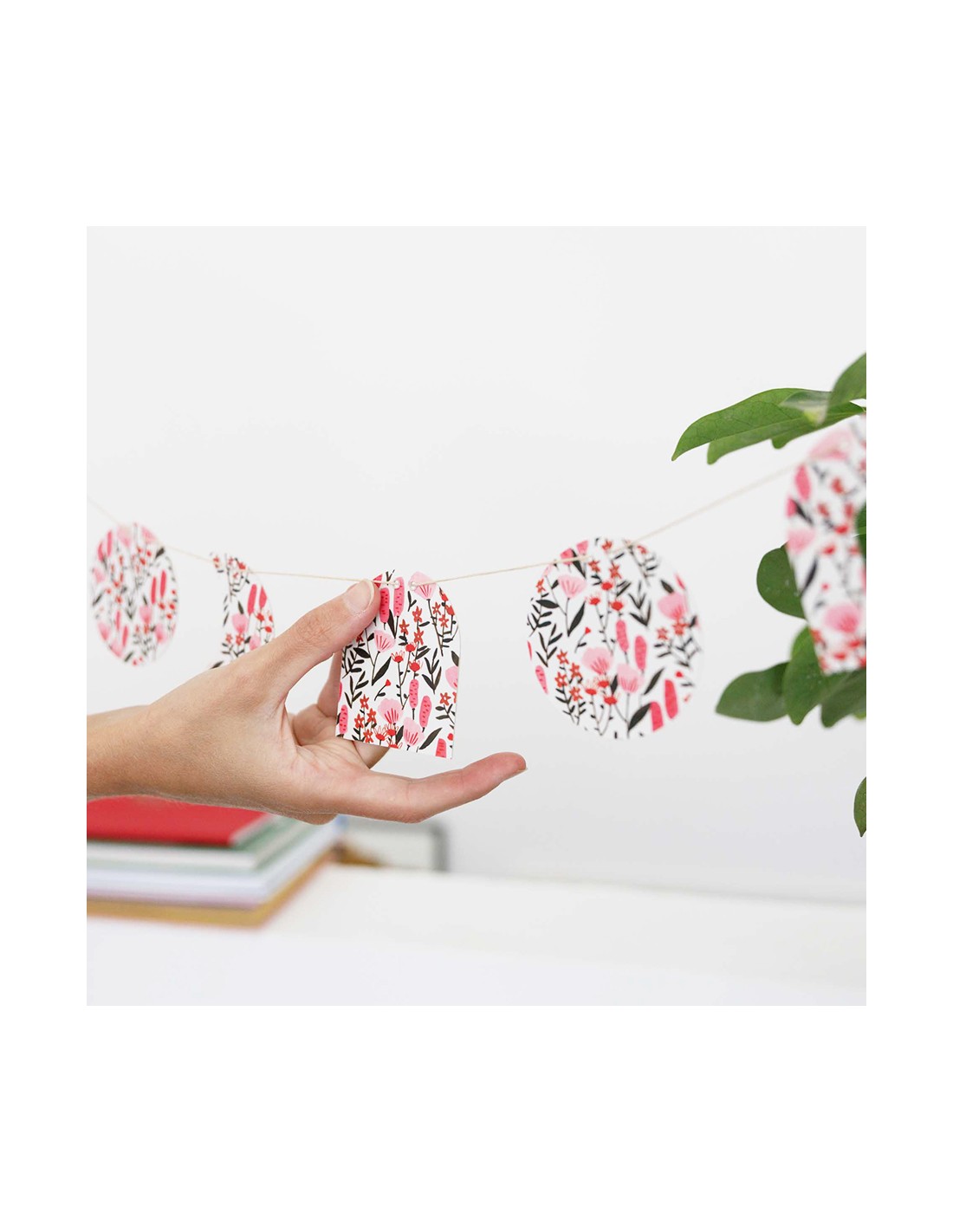 Esta guirnalda contiene 9 piezas de cartulina distribuidas a lo largo de 1,5 metros de largo y decorada con imágenes florales.