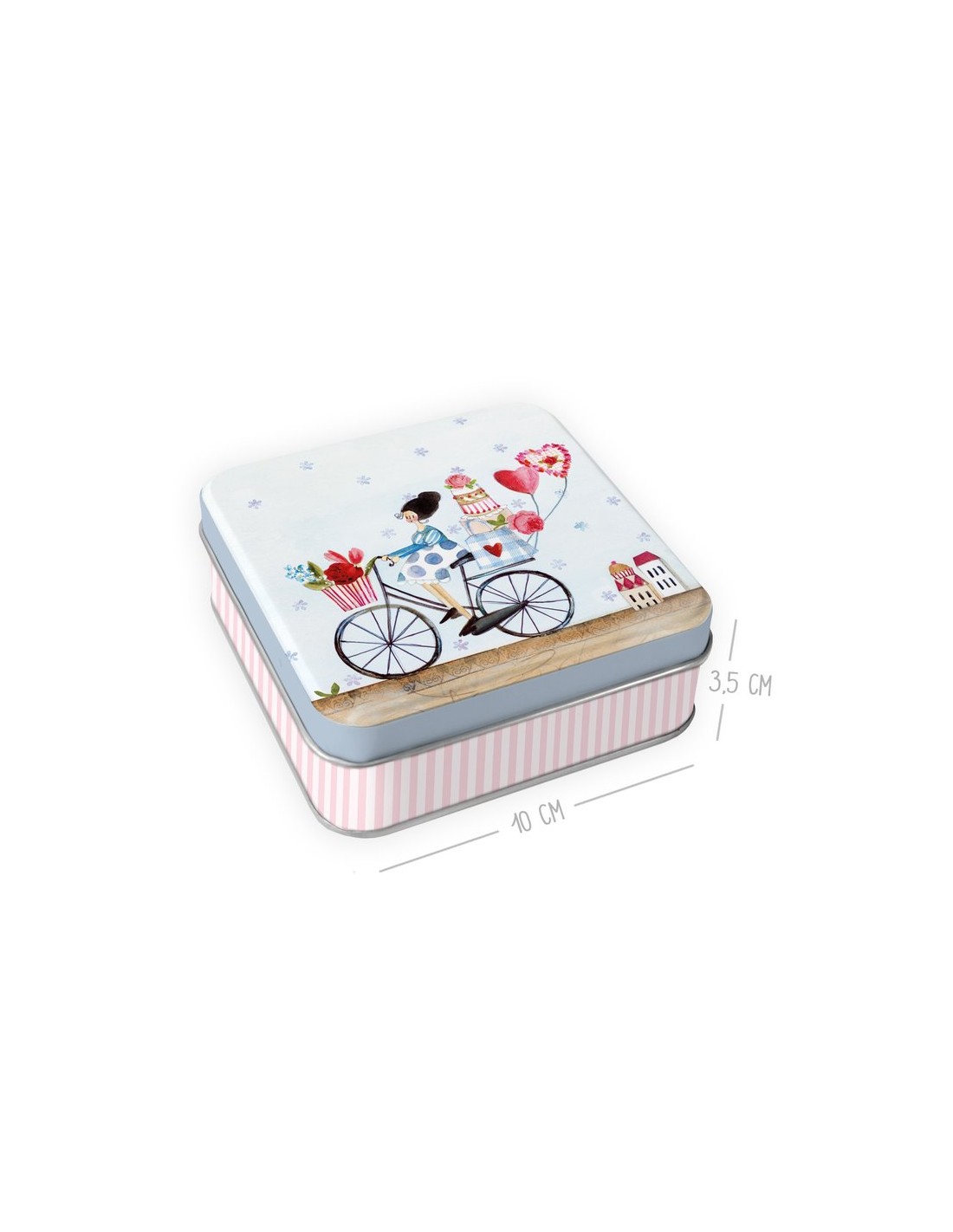 Esta cajita ilustrada con una mujer en bicicleta es el almacenaje ideal para guardar pequeñas cosas que pueden perderse fácilmente. También se pueden guardar caramelos, galletitas o cualquier otra cosa que necesite su lugar.