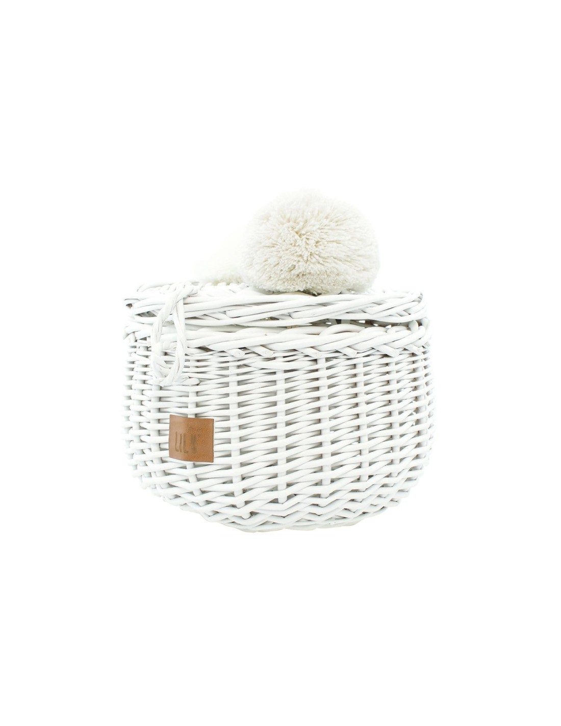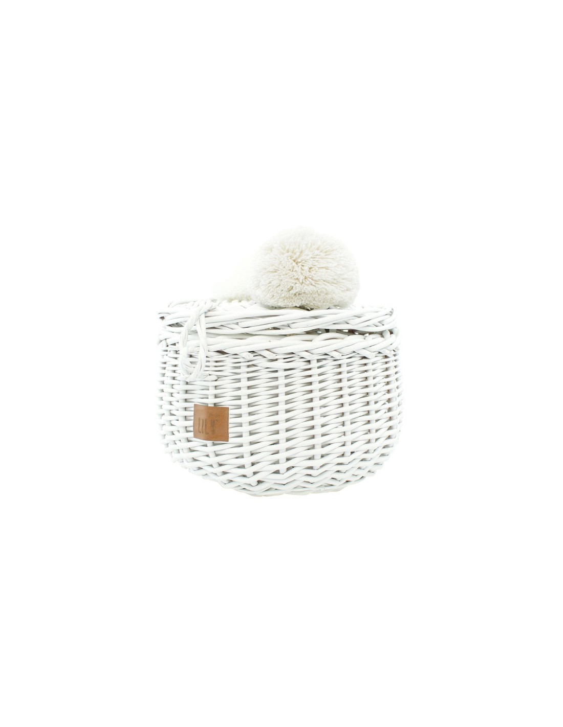 Esta cesta de mimbre es perfecta para tenerla en la habitación de los niños o de los adultos para guardar objetos pequeños y tenerlos siempre a mano. Está decorado con dos pompones, lo que le da un ligero toque de elegancia al objeto.