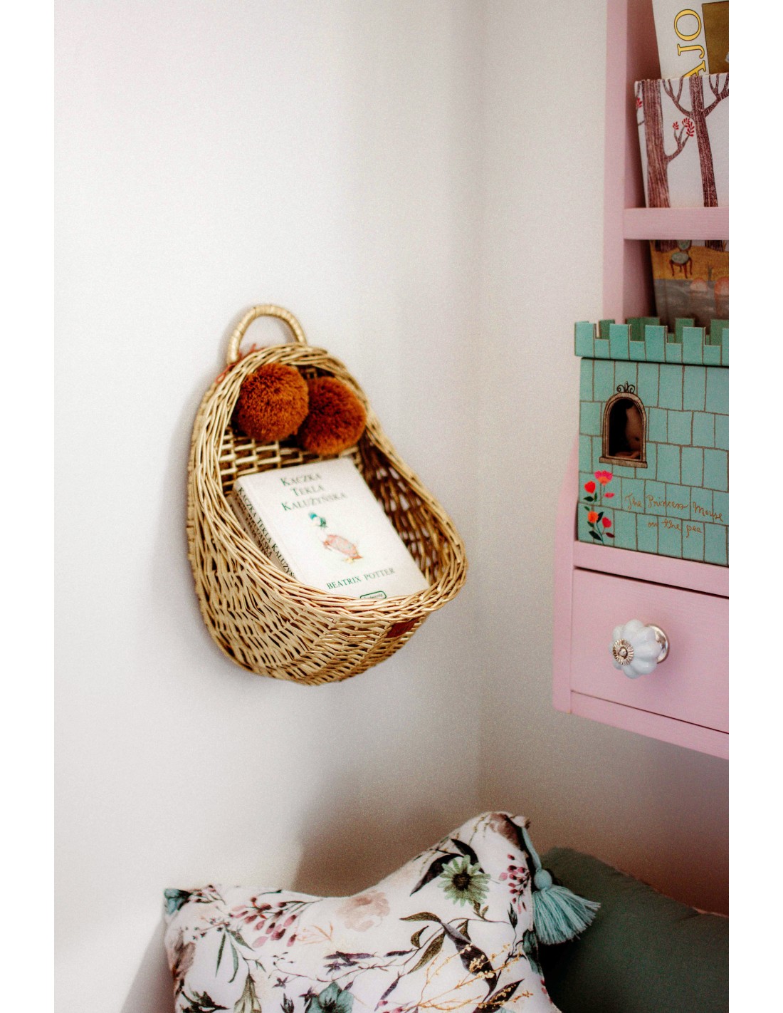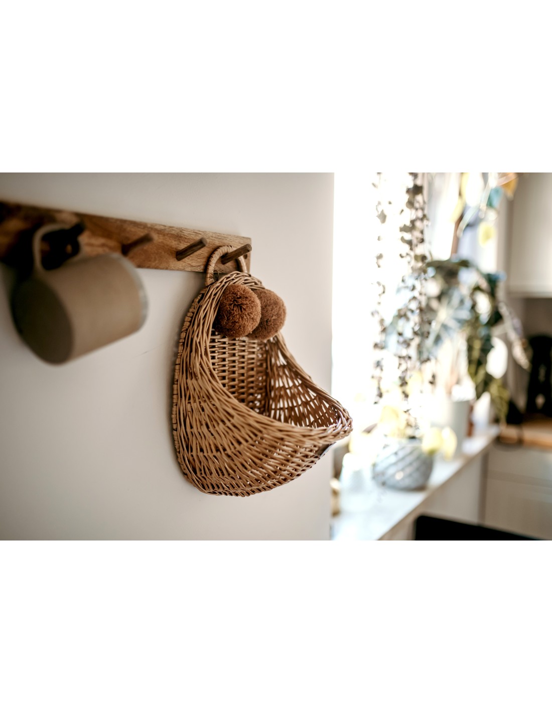 Esta bonita cesta de mimbre se cuelga en la pared y tiene la función de almacenar pequeños objetos o utensilios que necesitamos tener siempre a mano.