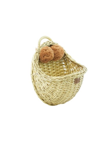 Preciosa cesta de mimbre con dos pompones, para colgar en la pared.