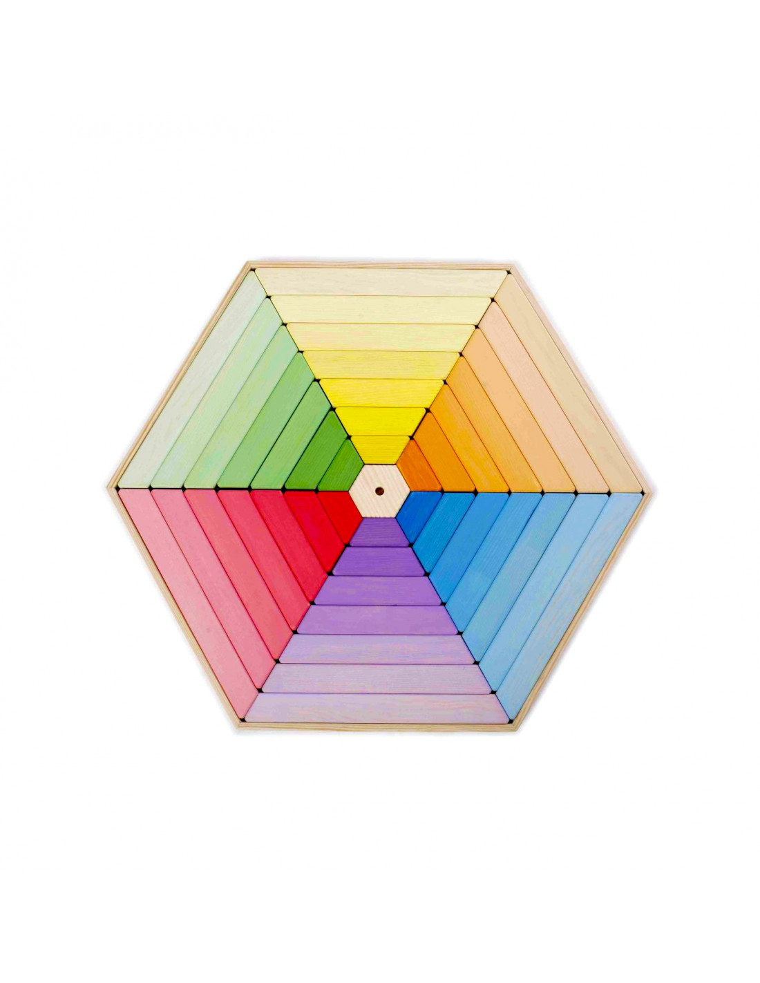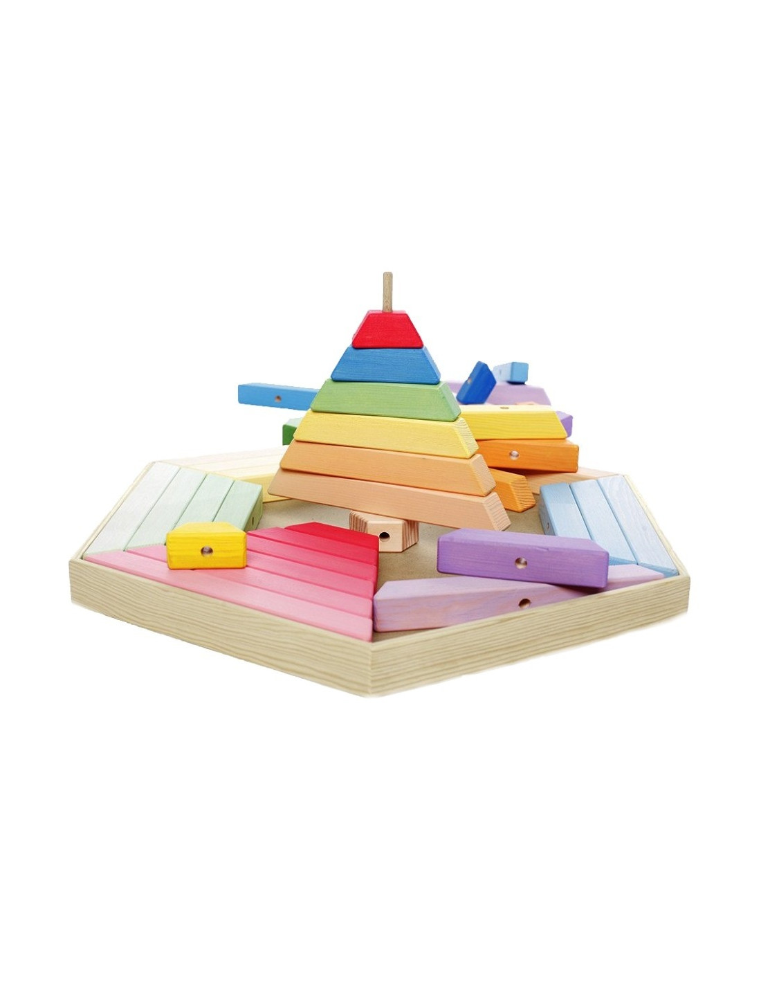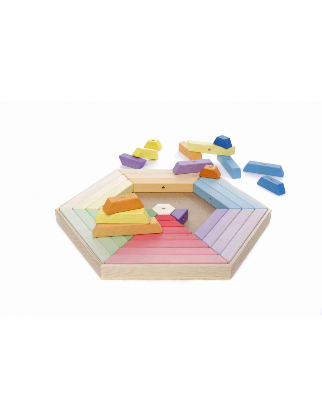 Tengo 42 piezas de 6 colores en diferentes tonalidades y 2 varillas de madera. En cada pieza tengo un agujero para que puedas introducir por él una de mis varillas y crear así construcciones combinando tamaños y colores.