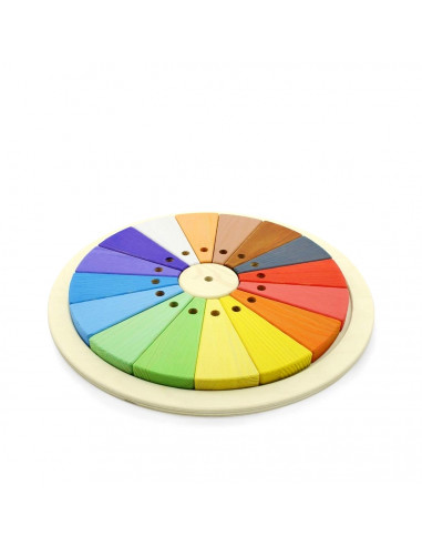 Tengo forma circular y estoy formado por 16 piezas y un círculo central. Cada pieza es de un color diferente y cada una tiene un agujero en su extremo más estrecho, por donde poder introducir una varilla de madera y construir, por ejemplo, una escalera por donde dejar caer una bola de madera.