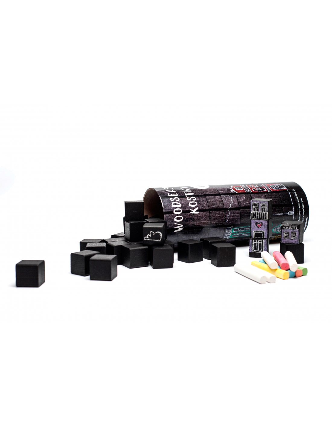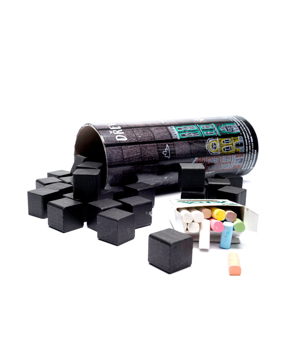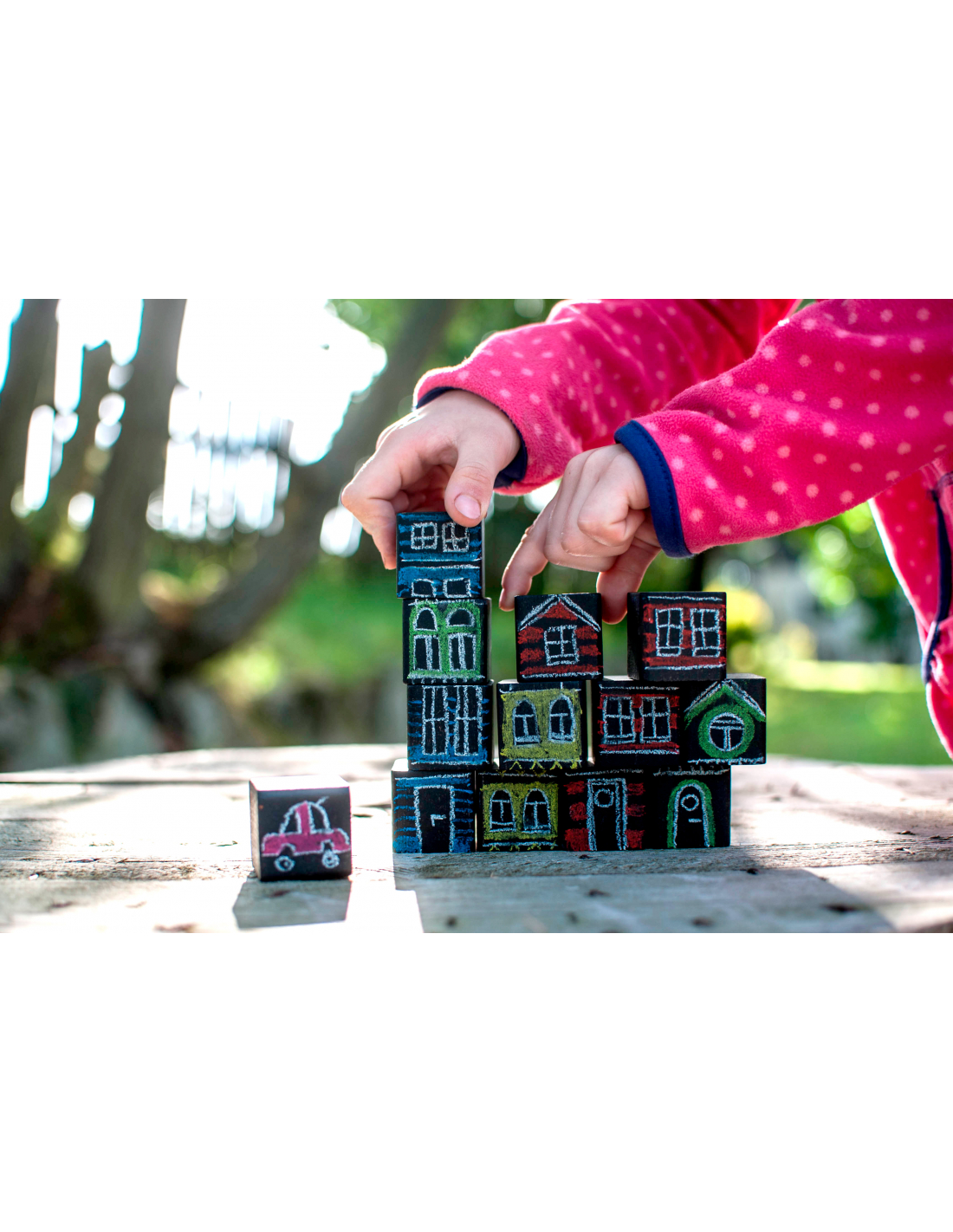 Este conjunto de cubos de madera está compuesto por 25 piezas recubiertas con pintura de pizarra. Este recubrimiento permite pintar sobre ellos con tizas o tizas pastel y crear así diferentes escenarios para el juego libre. También puede dibujarse una figura o paisaje utilizando todos los cubos y luego jugar a construirlo como si fuera un puzzle.