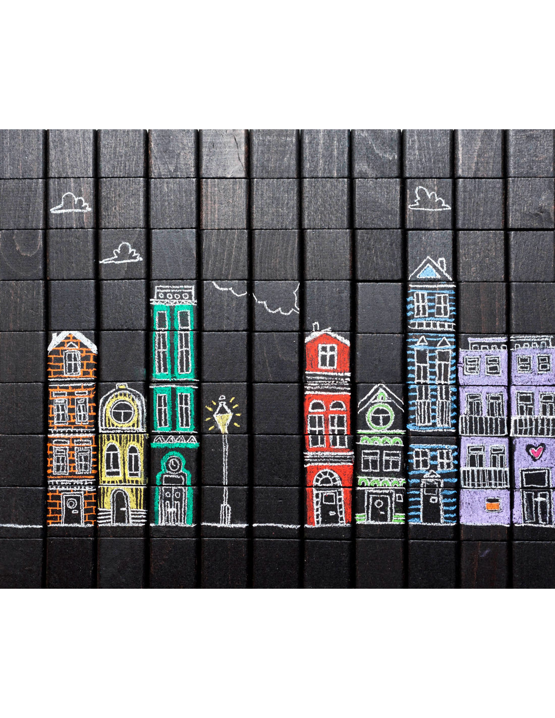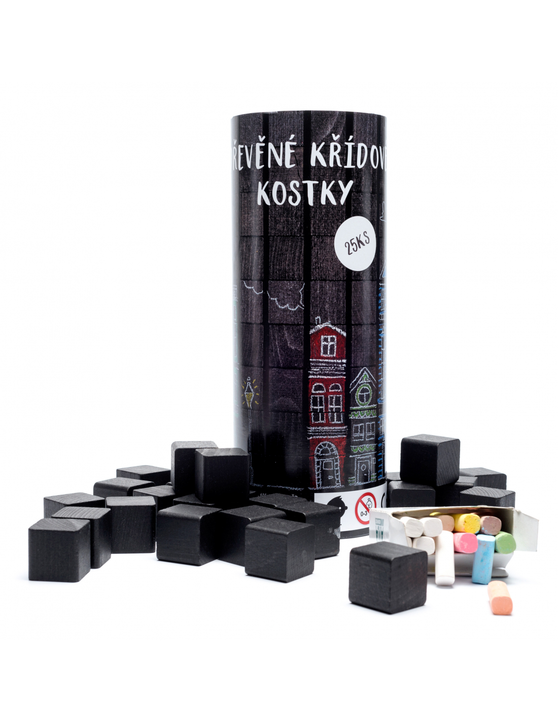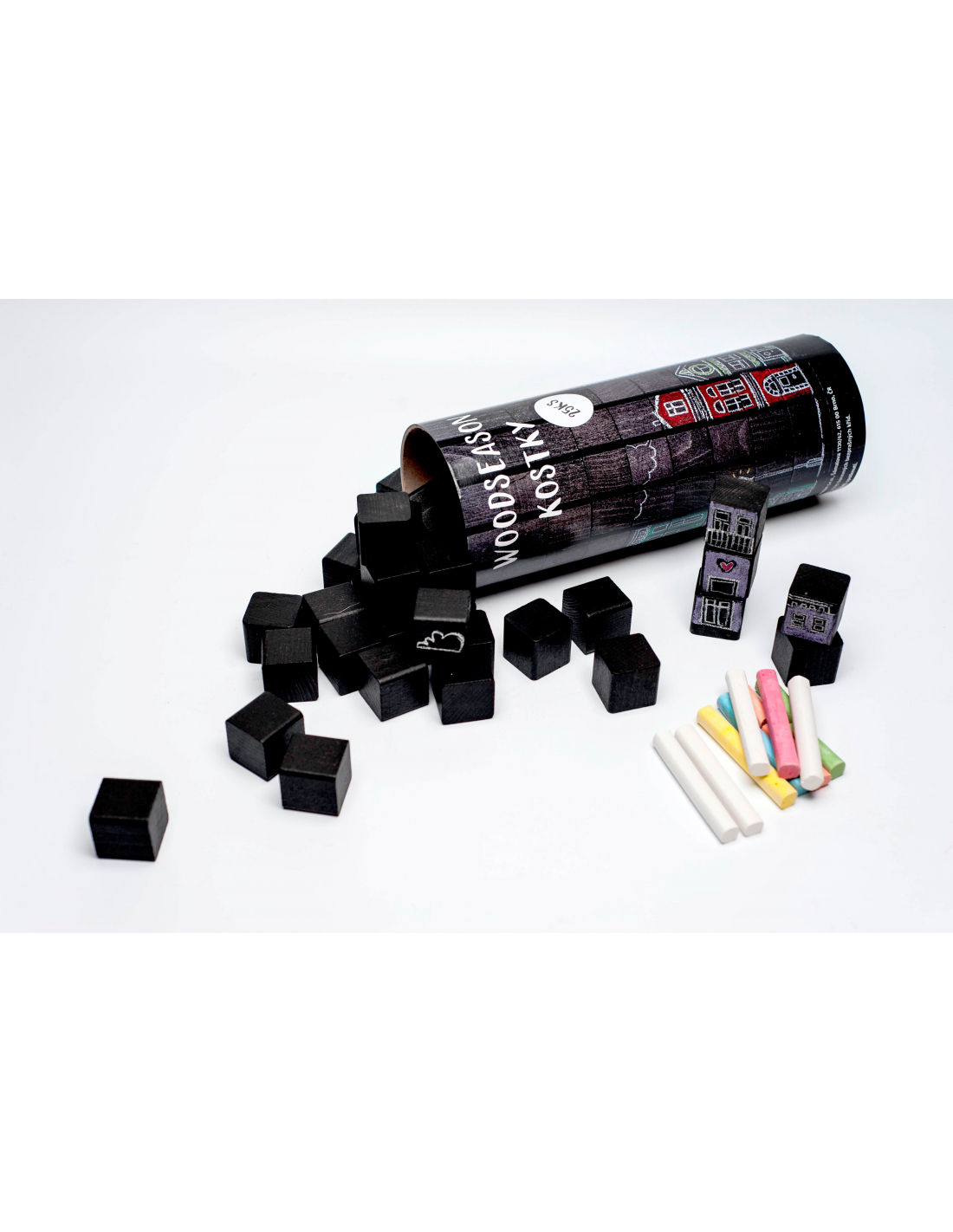 Este conjunto de cubos de madera está compuesto por 25 piezas recubiertas con pintura de pizarra. Este recubrimiento permite pintar sobre ellos con tizas o tizas pastel y crear así diferentes escenarios para el juego libre. También puede dibujarse una figura o paisaje utilizando todos los cubos y luego jugar a construirlo como si fuera un puzzle.