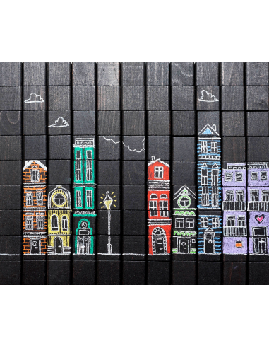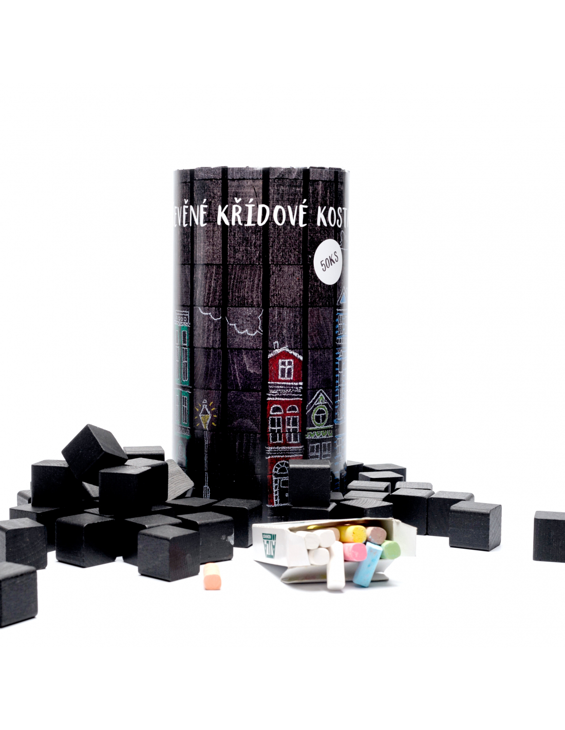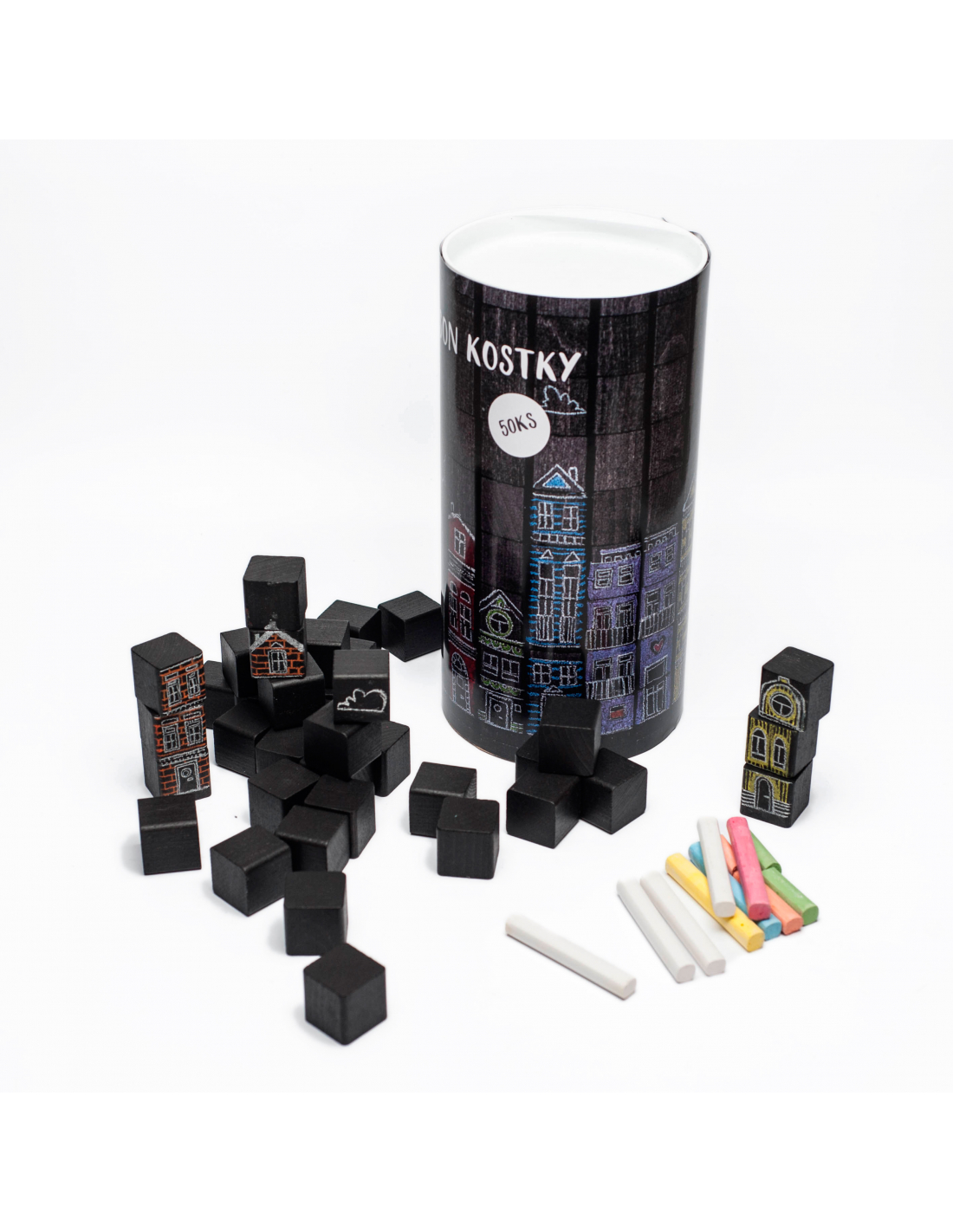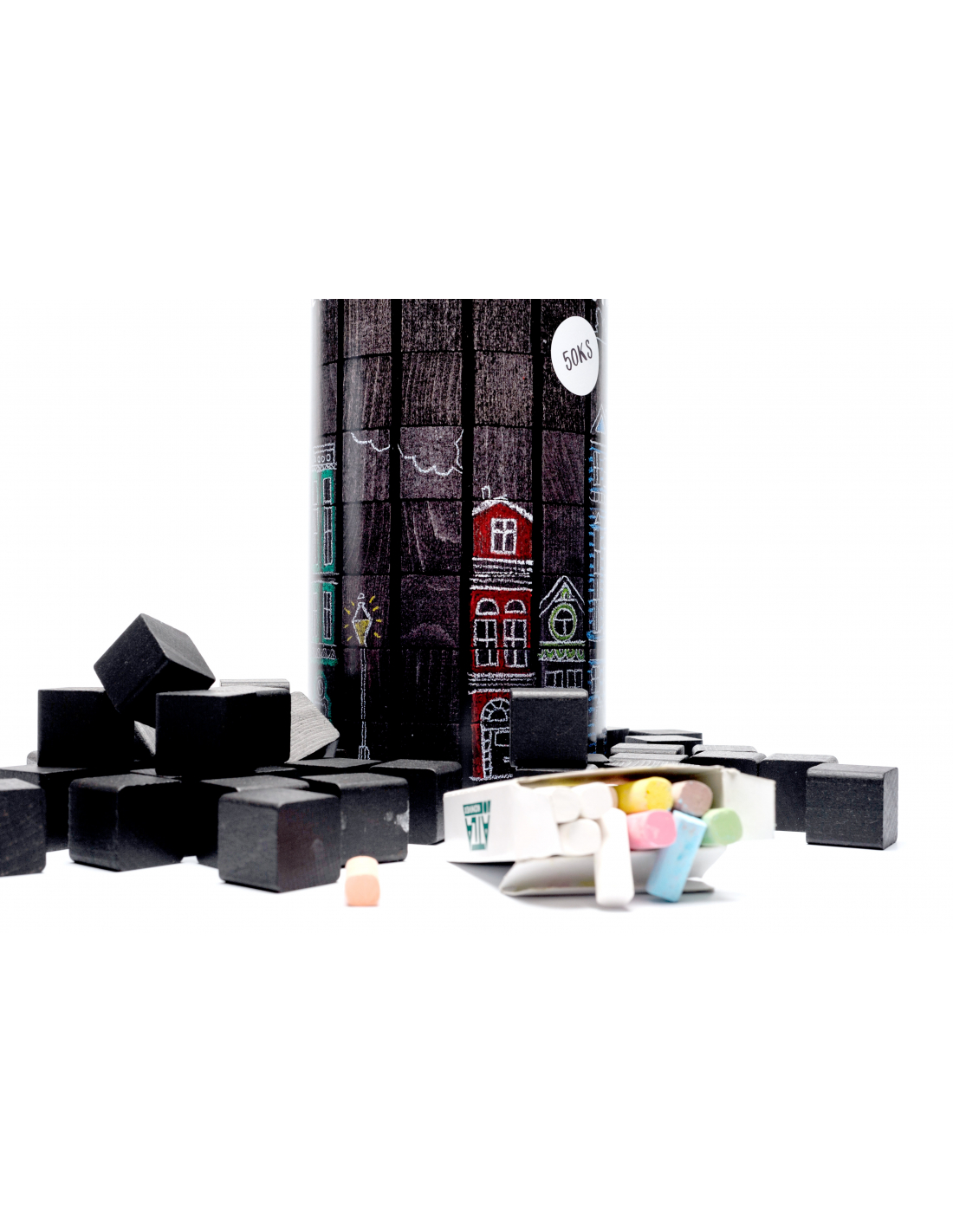 Este conjunto de cubos de madera está compuesto por 50 piezas recubiertas con pintura de pizarra. Este recubrimiento permite pintar sobre ellos con tizas o tizas pastel y crear así diferentes escenarios para el juego libre. También puede dibujarse una figura o paisaje utilizando todos los cubos y luego jugar a construirlo como si fuera un puzzle.