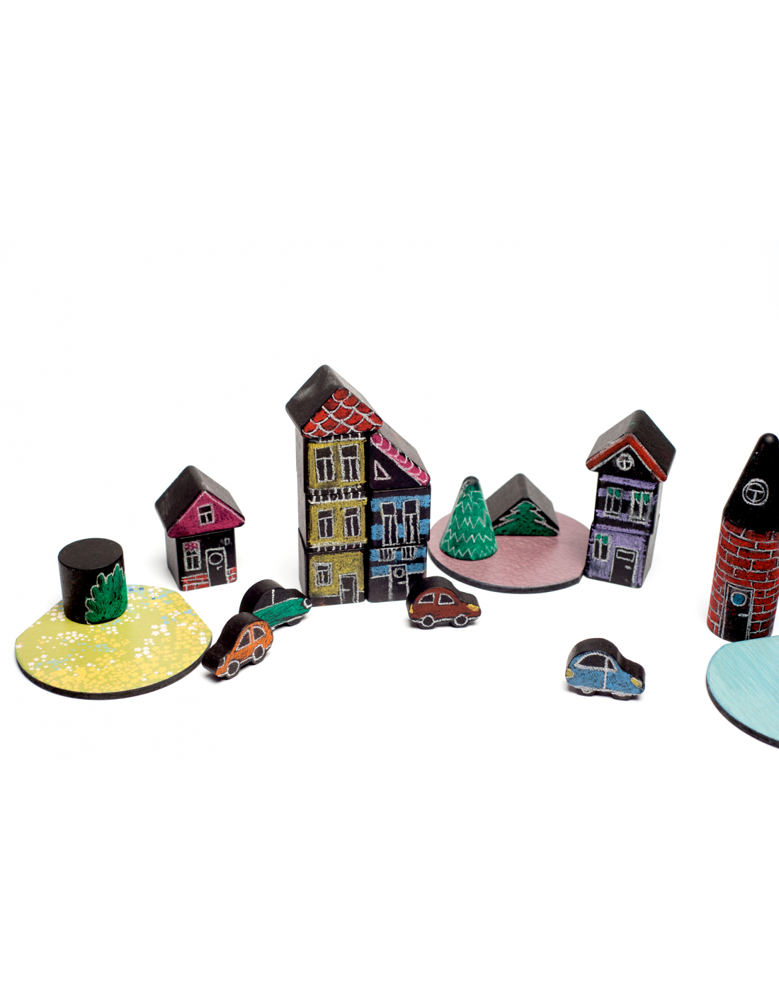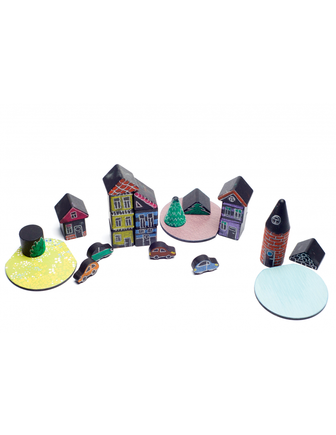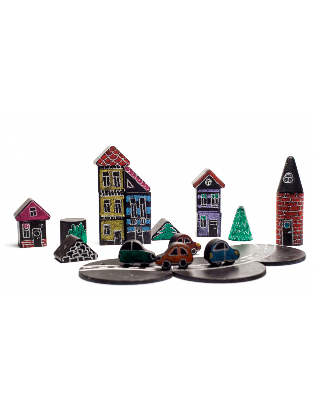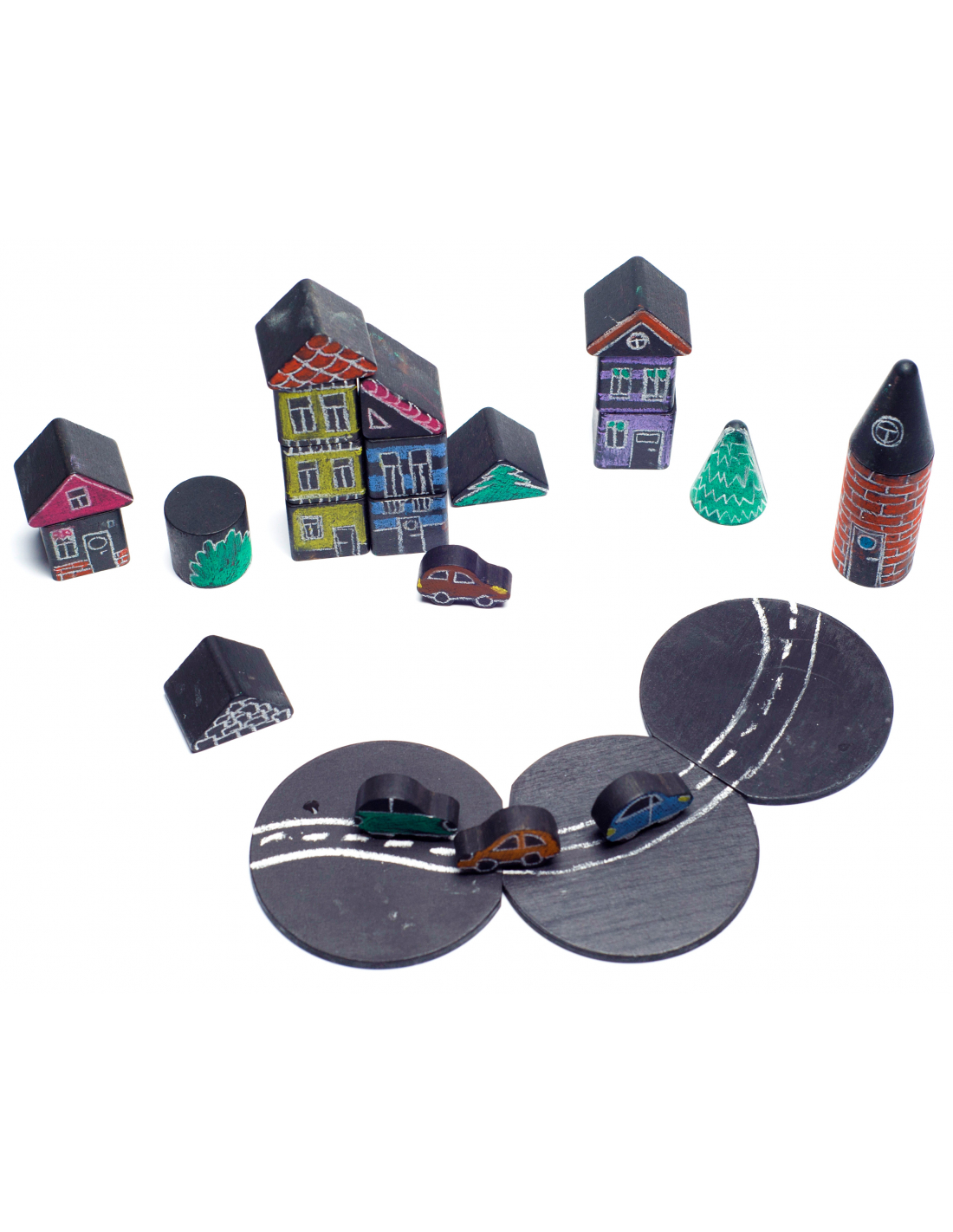 El conjunto Creative Town ofrece una combinación única para constructores y artistas al mismo tiempo. Por un lado se pueden construir casas, automóviles y un pueblo entero. Y, por otro lado, se puede dibujar sobre las piezas con tizas para dar una vida llena de color a las creaciones.