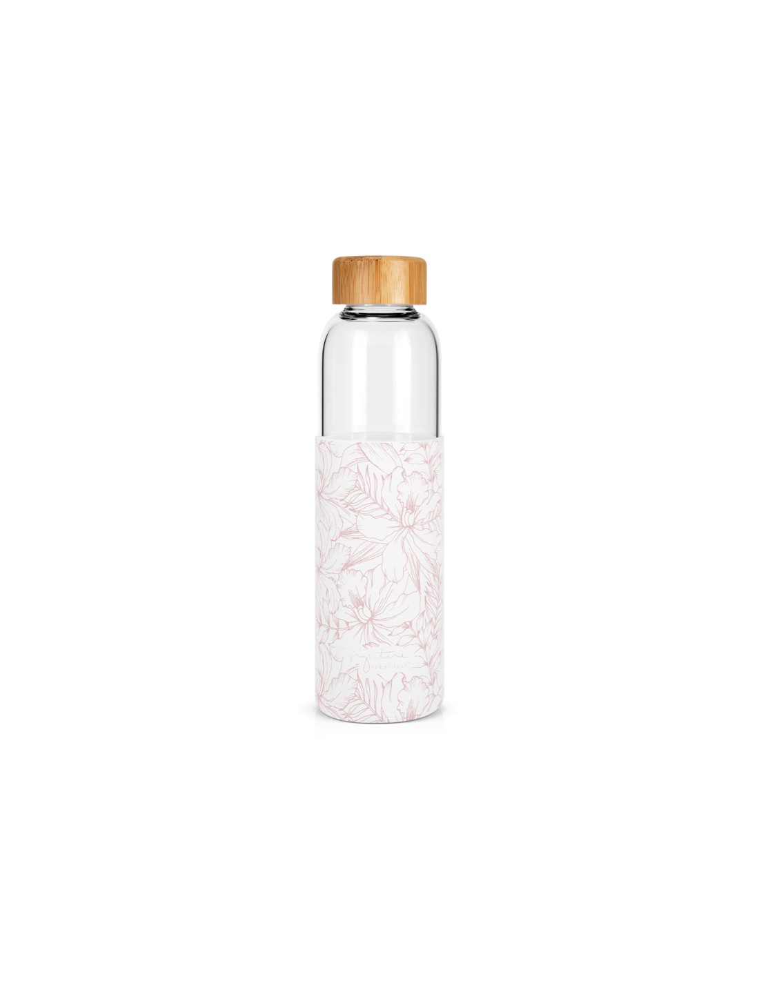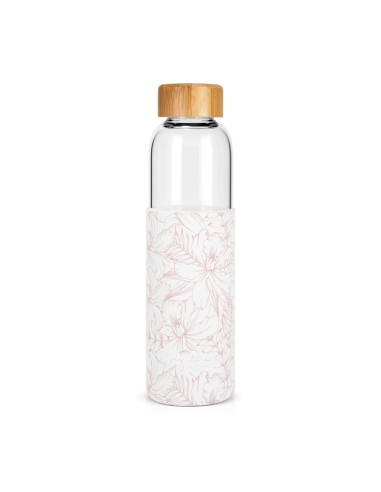 Esta bonita botella de vidrio tiene una protección de silicona en la parte inferior que la protegerá ante golpes inesperados, pero mantiene la parte superior a la vista para que puedas ver el contenido. El tapón es de bambú. Las botellas de vidrio son los mejores recipientes para bebidas como agua o zumos porque no desprenden partículas nocivas para la salud.