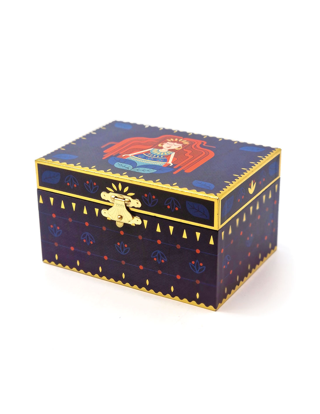 Joyero musical decorado con motivos dorados.