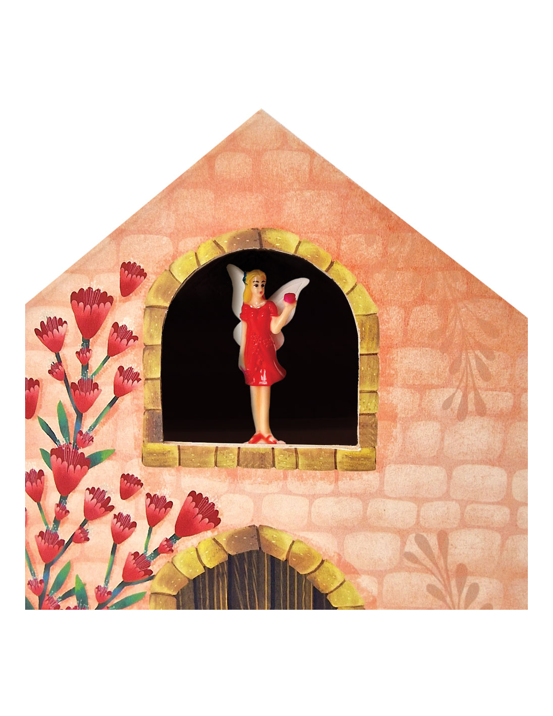 - Tiene forma de encantadora casita de hadas con detalles en el interior y exterior.