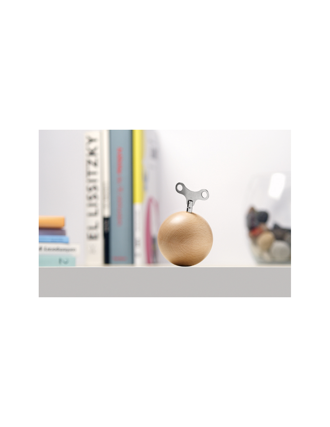 Está hecha de madera maciza de haya, pulida de manera natural y recubierta con aceites naturales de alta calidad que le dan a la madera una vitalidad única. La llave que acciona la pieza musical es de latón. Incluye un anillo de metal que se coloca en la base para que la bola de sostenga de pie. Viene en una caja de regalo de alta calidad.