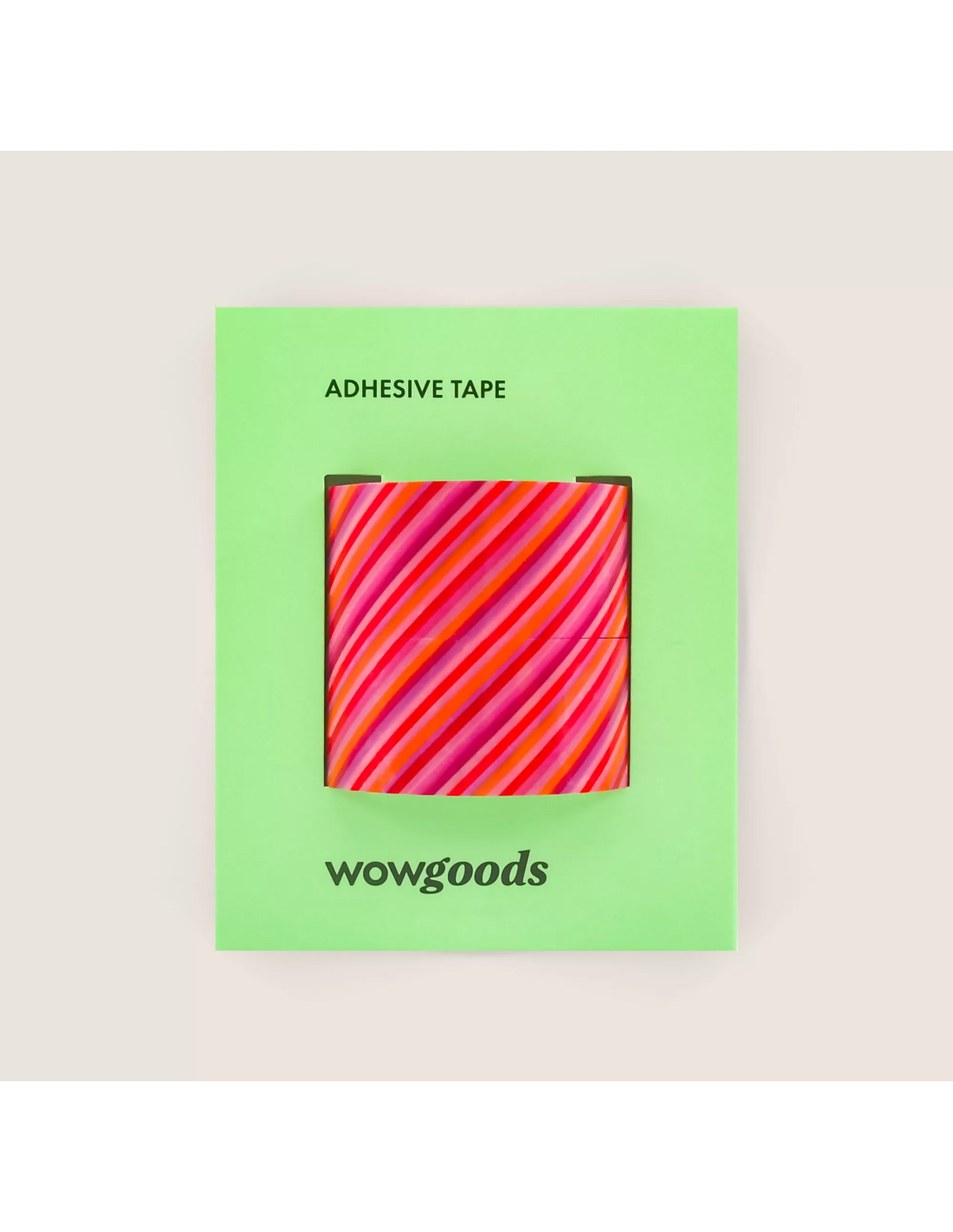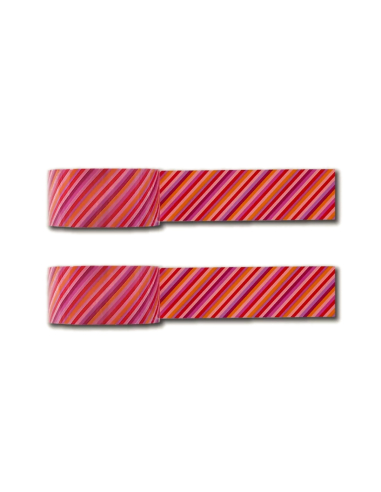 - Vienen dos rollos de celo estampado con finas rayas de colores rojos, lilas y naranjas.