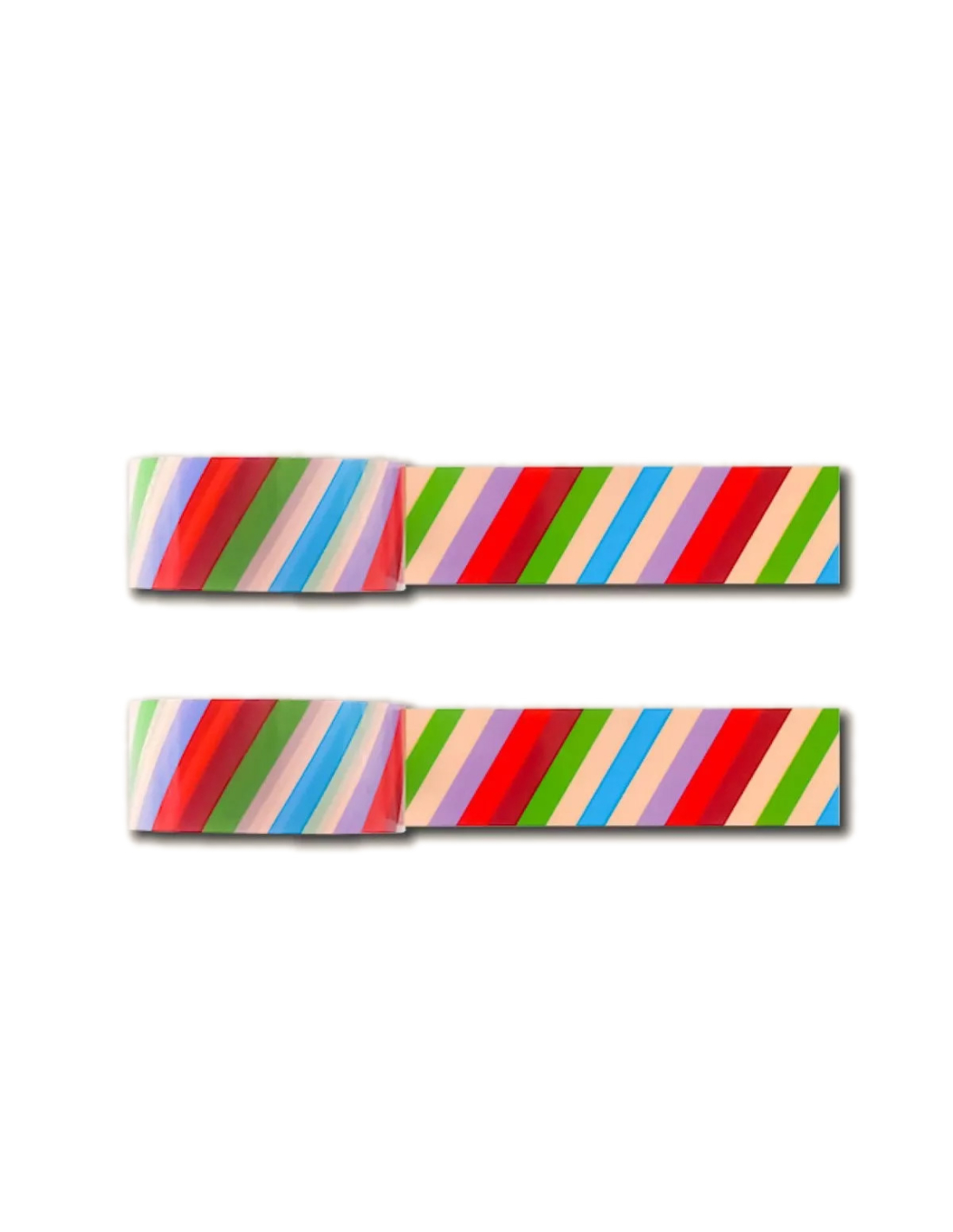 - Vienen dos rollos de celo estampado con rayas de colores.