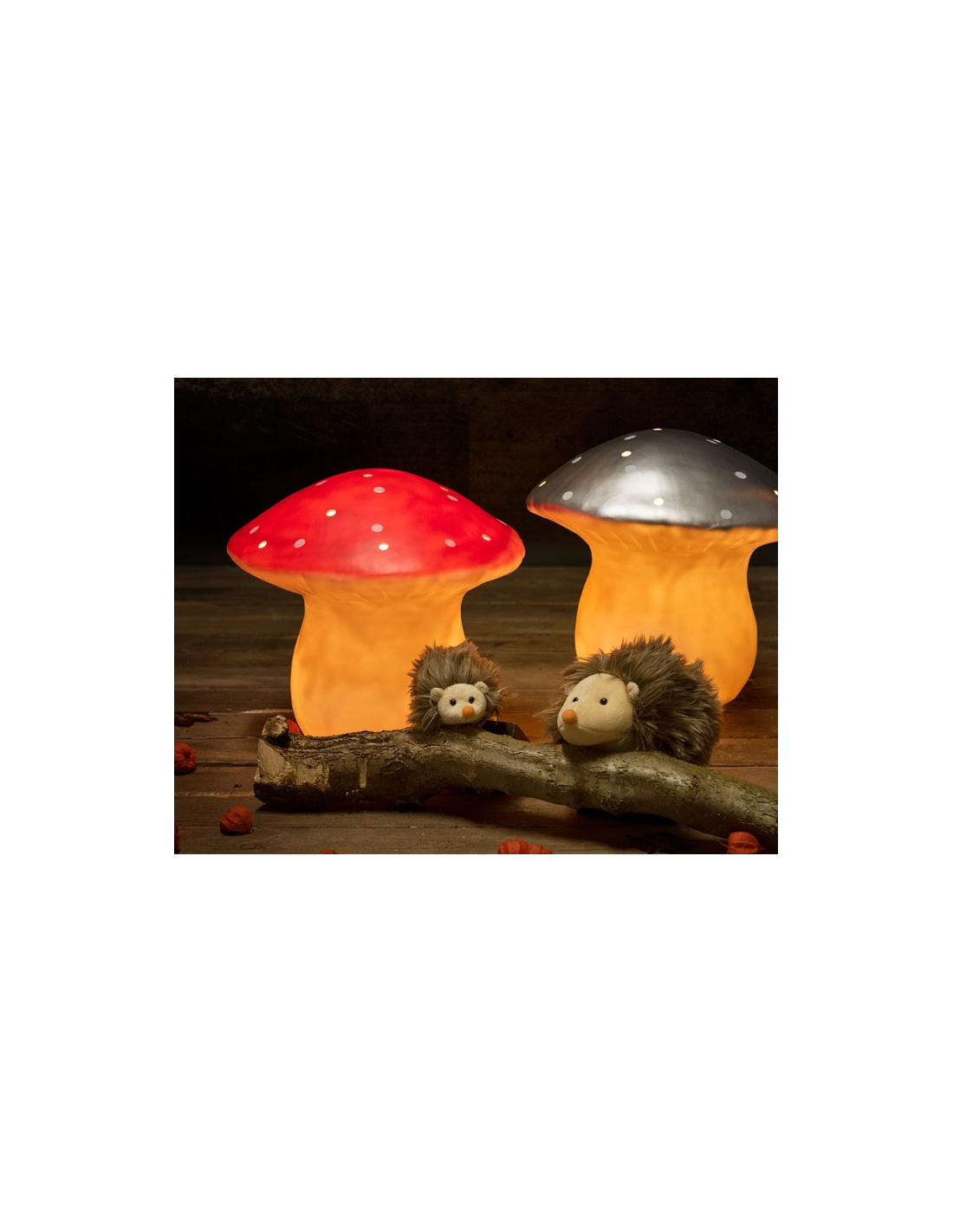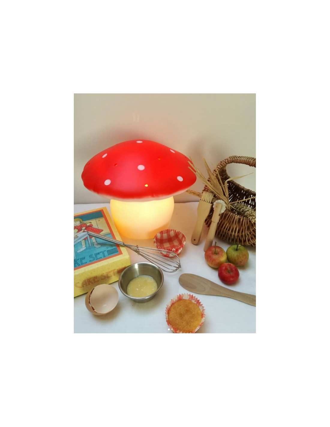 - Lámpara con forma de seta de color rojo.