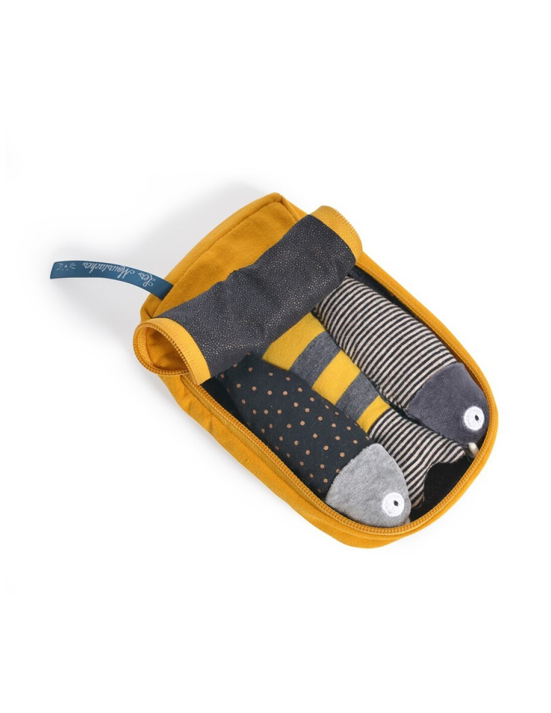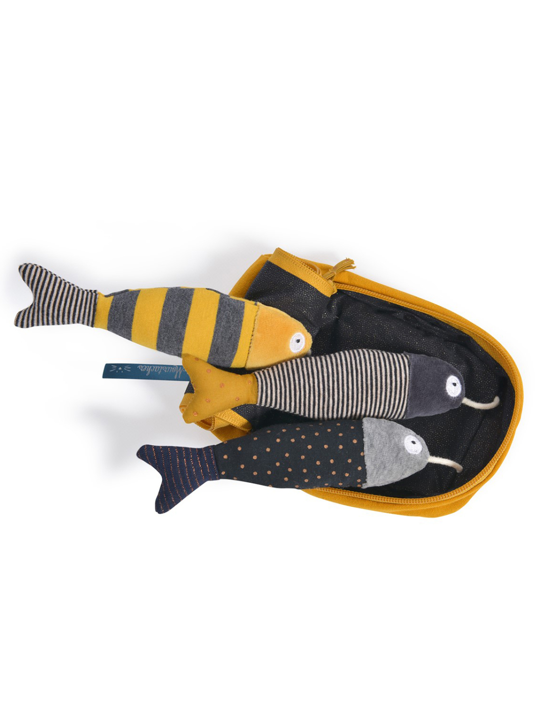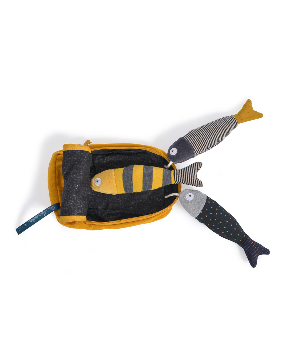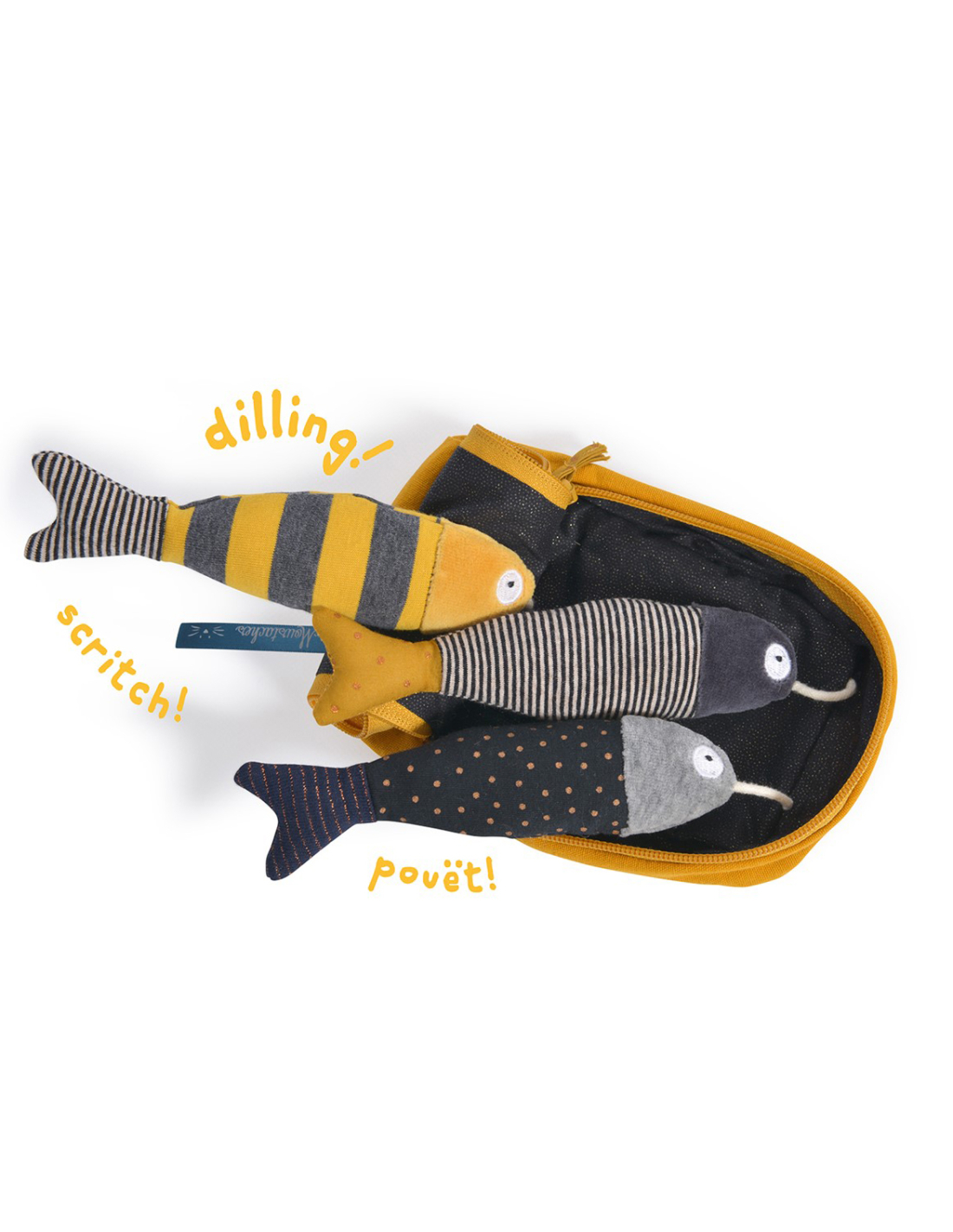 - Contiene tres sardinas con las que explorar diferentes sonidos: una es un sonajero, otra tiene un papel arrugado en su interior que hace ruido y otra emite el sonido como de bocina al apretarla.