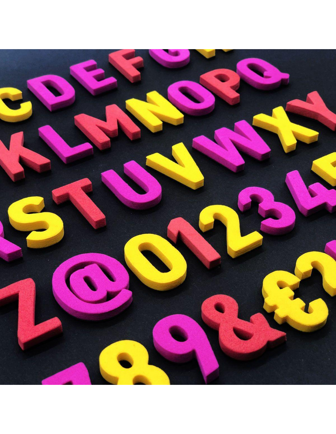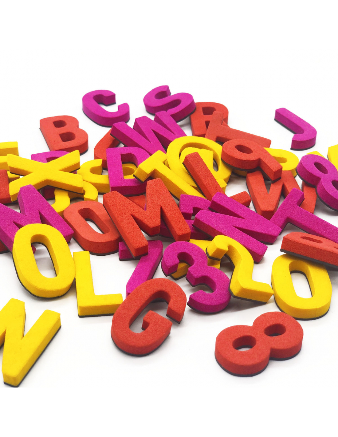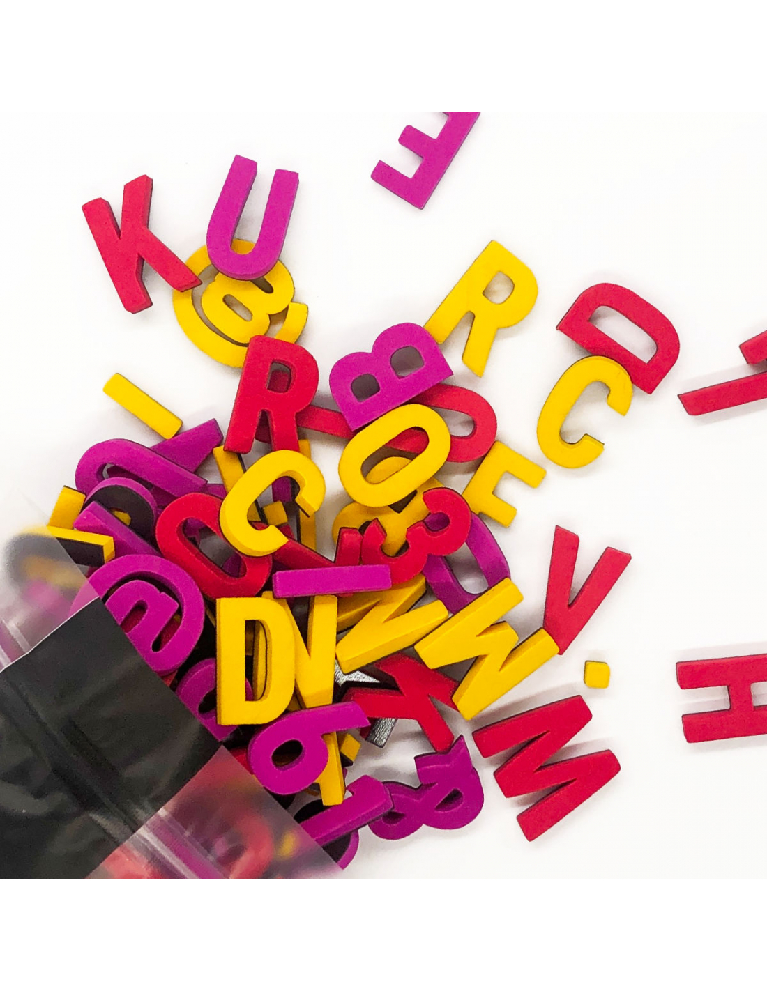 200 letras y números magnéticos de colores fucsia, rojo y amarillo