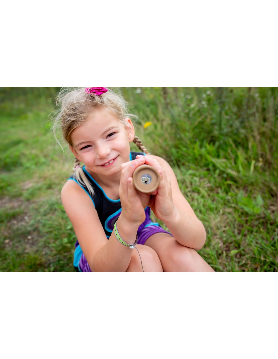 Este caleidoscopio viene preparado para que cada uno introduzca en él los elementos con los que quiera experimentar la magia de este objeto. Se pueden introducir pétalos de flores o cualquier otro elemento que se encuentre en la naturaleza.