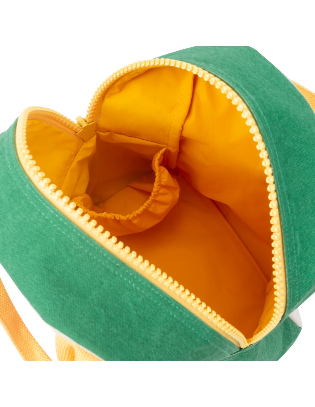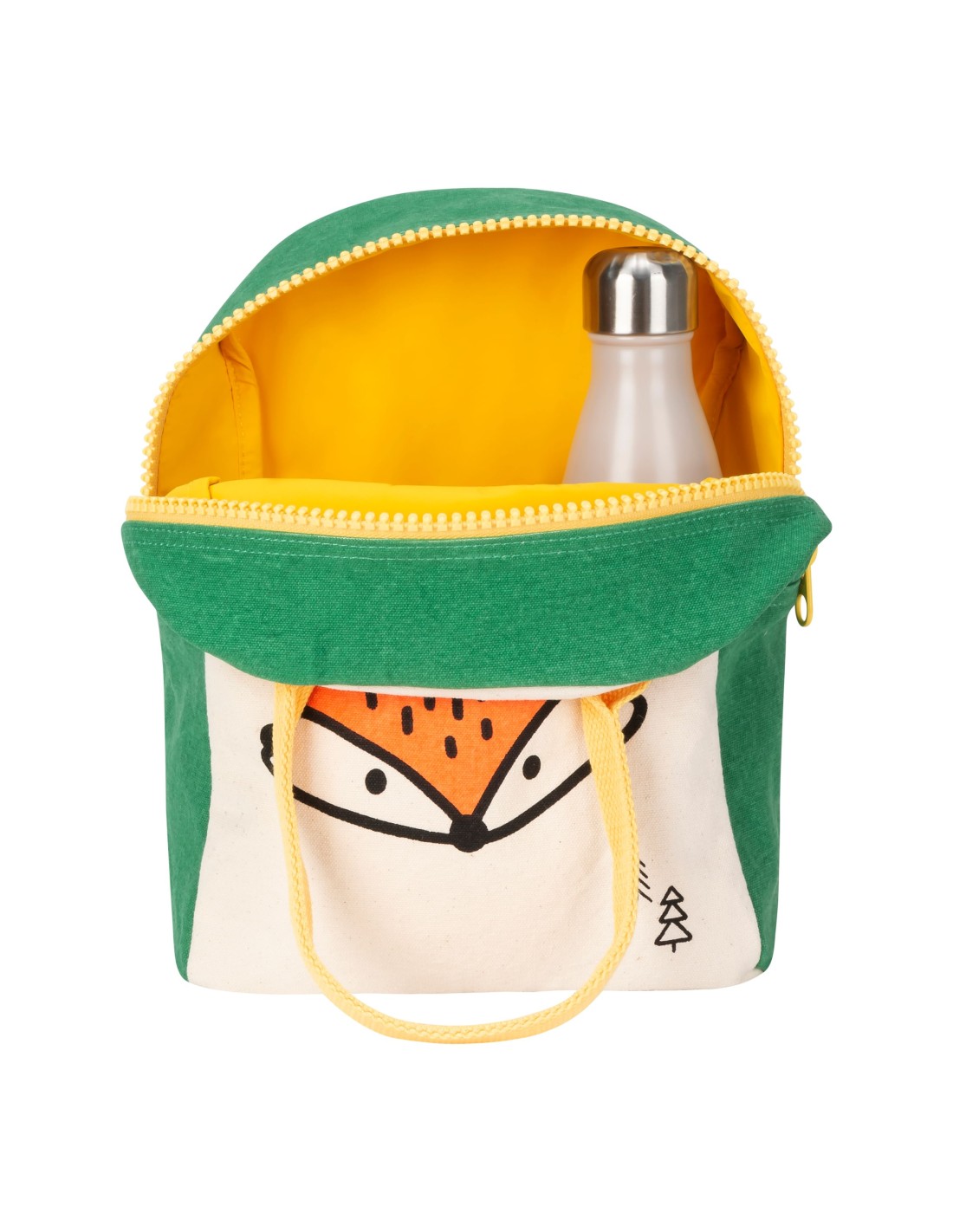 Esta bolsa de almuerzo grande y espaciosa tiene un forro apto para alimentos que se puede enjuagar en caso de derrames. Es totalmente lavable a máquina. Tiene un bolsillo interior para una botella de agua o una bolsa de hielo. Está fabricada de manera sostenible y ética con materiales orgánicos y reciclados. Se puede plegar y no ocupa espacio.