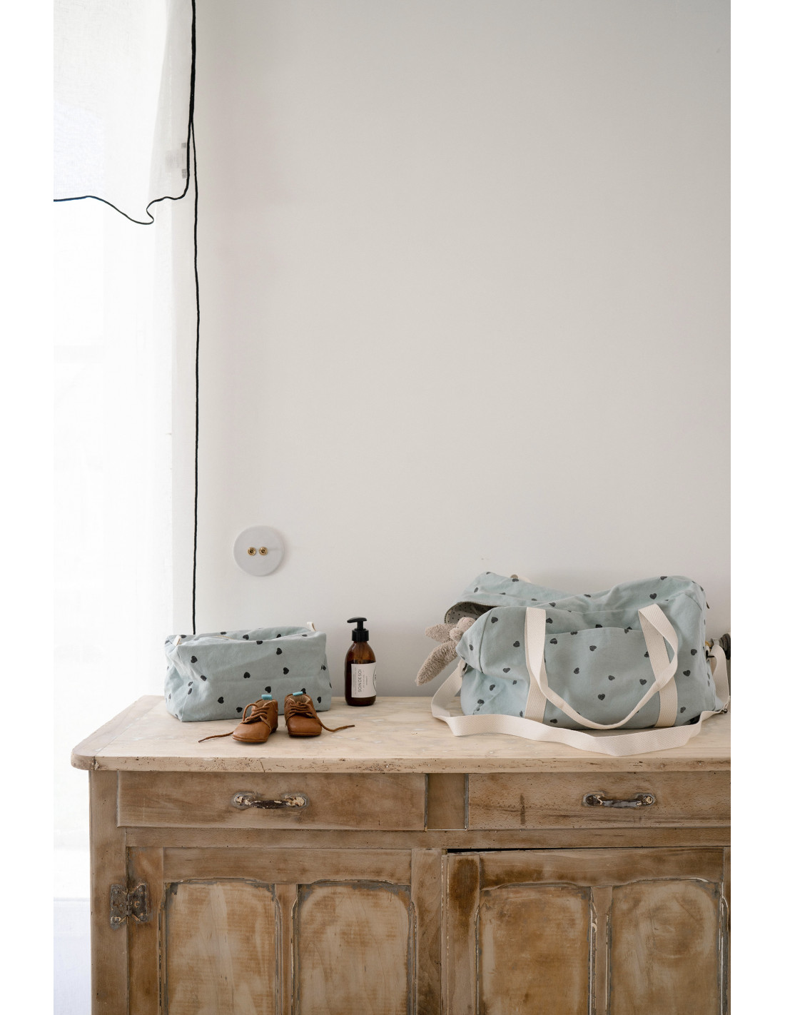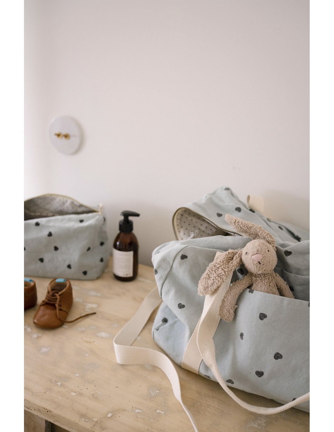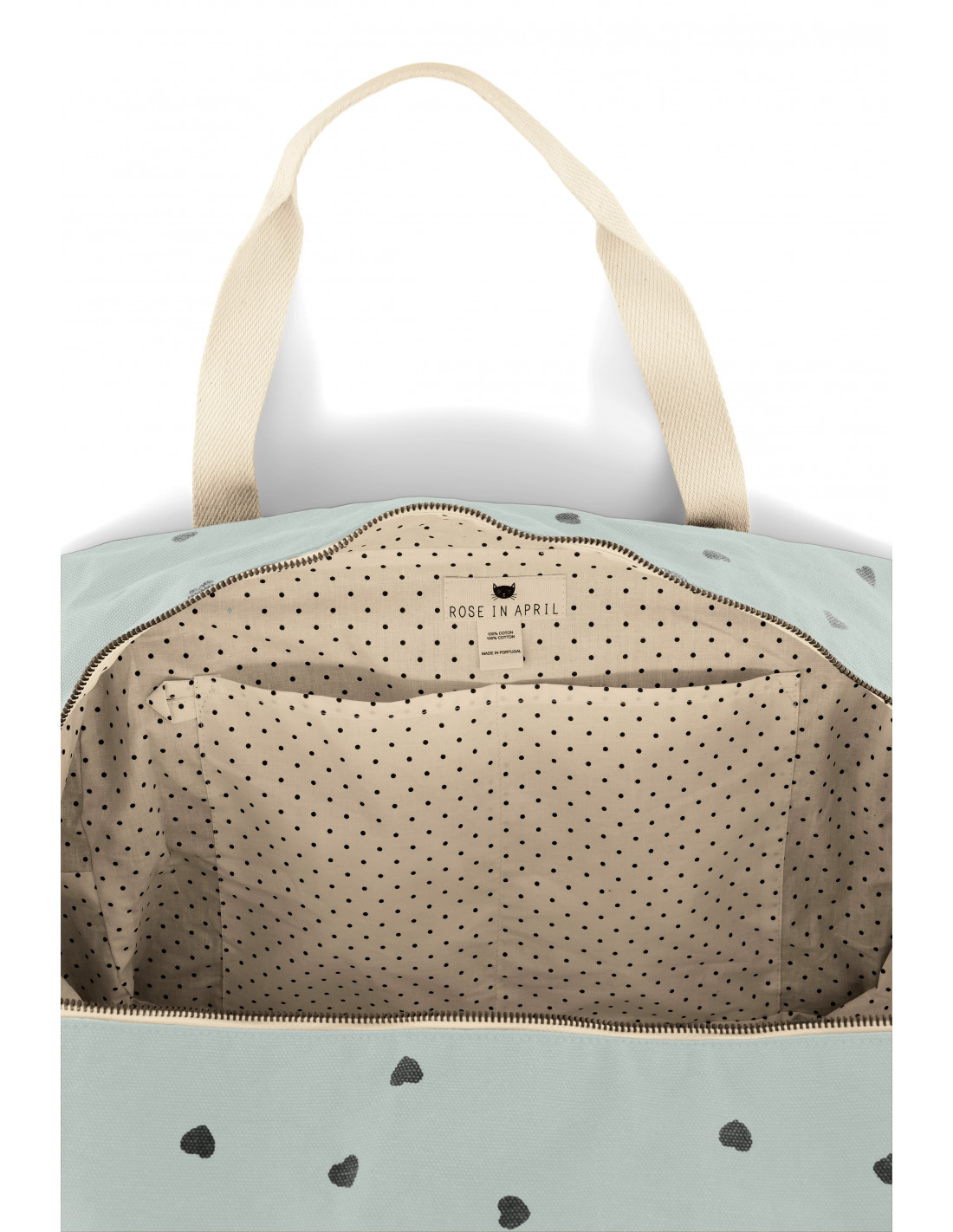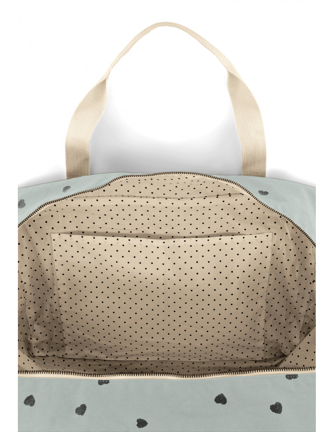 - El interior, de color crudo con topos grises estampados, es impermeable ya que está forrado con tela de algodón revestido.