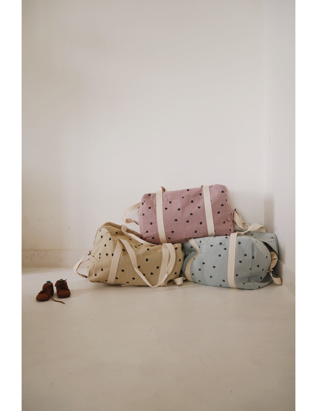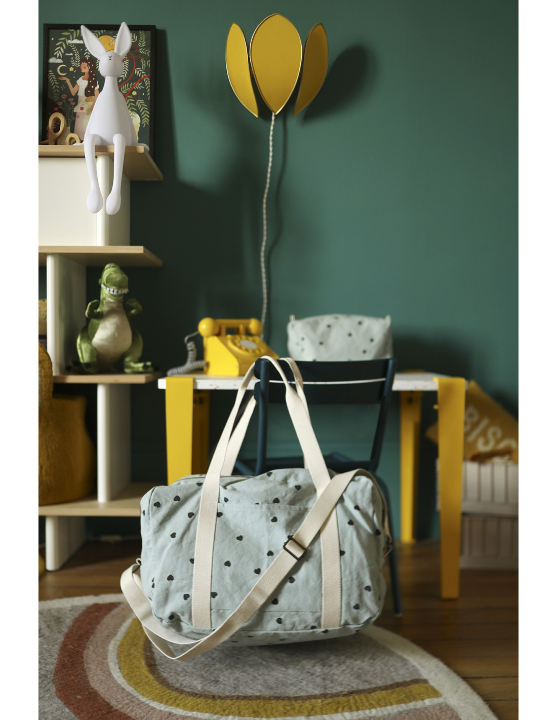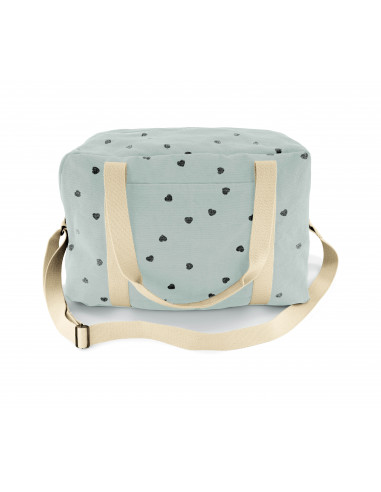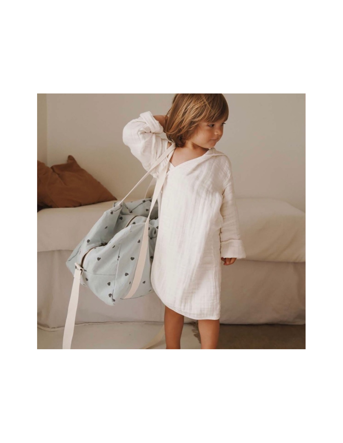- El interior, de color crudo con topos grises estampados, es impermeable ya que está forrado con tela de algodón revestido.