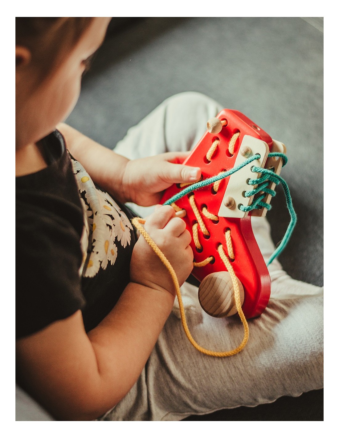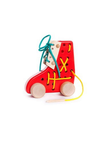 Juguete educativo de madera para aprender a enhebrar y a atar un zapato.