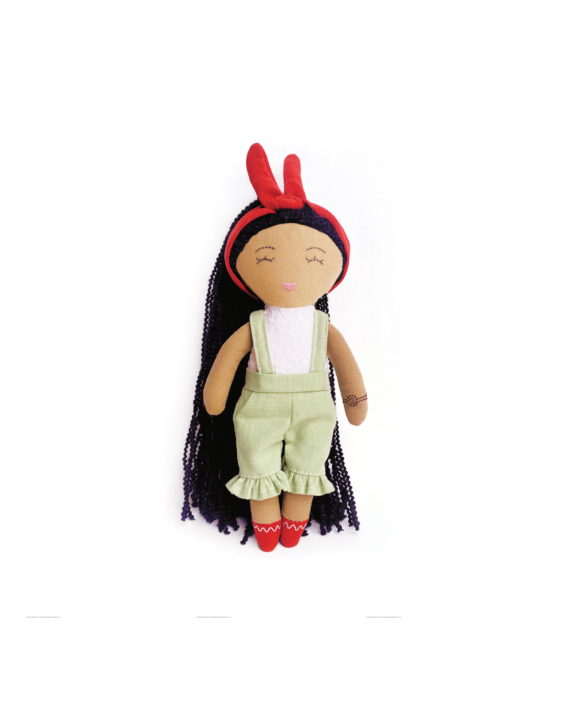 - Maya mide 20 cm de largo, tiene los rasgos faciales bordados, cabello largo y moreno, un top blanco bordado y un mono verde menta que se puede quitar.