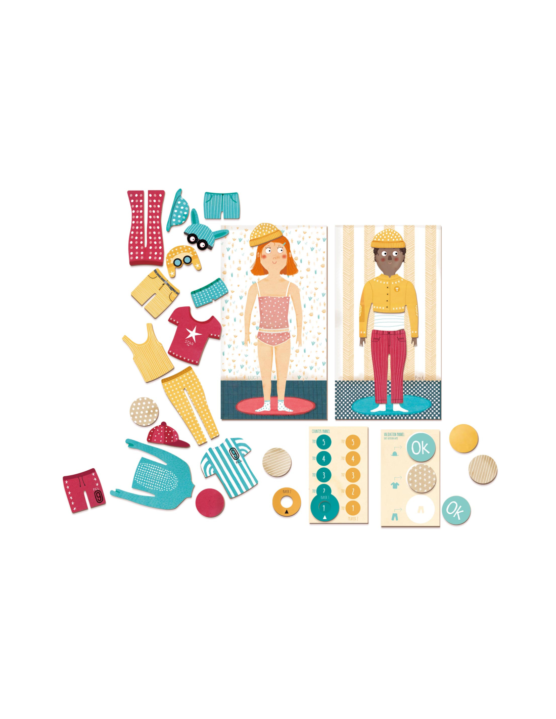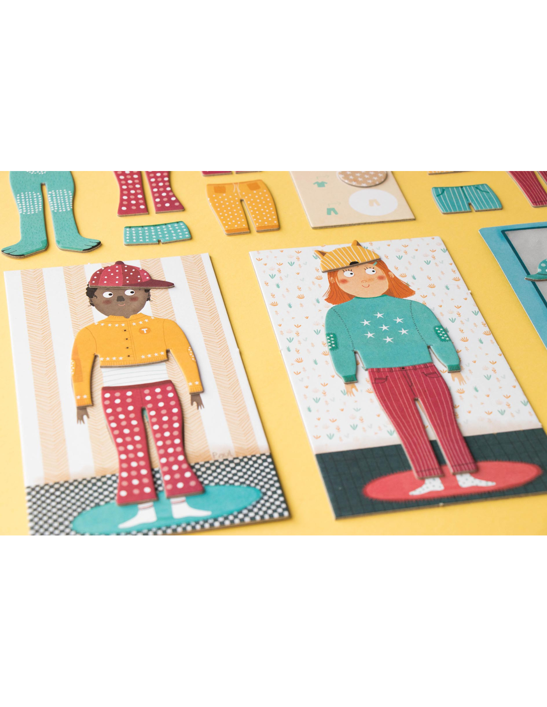 - Incluye dos personajes, 27 prendas, 2 tableros de control, 2 paneles a modo de armarios, y 1 bolsita de tela para guardar las piezas.