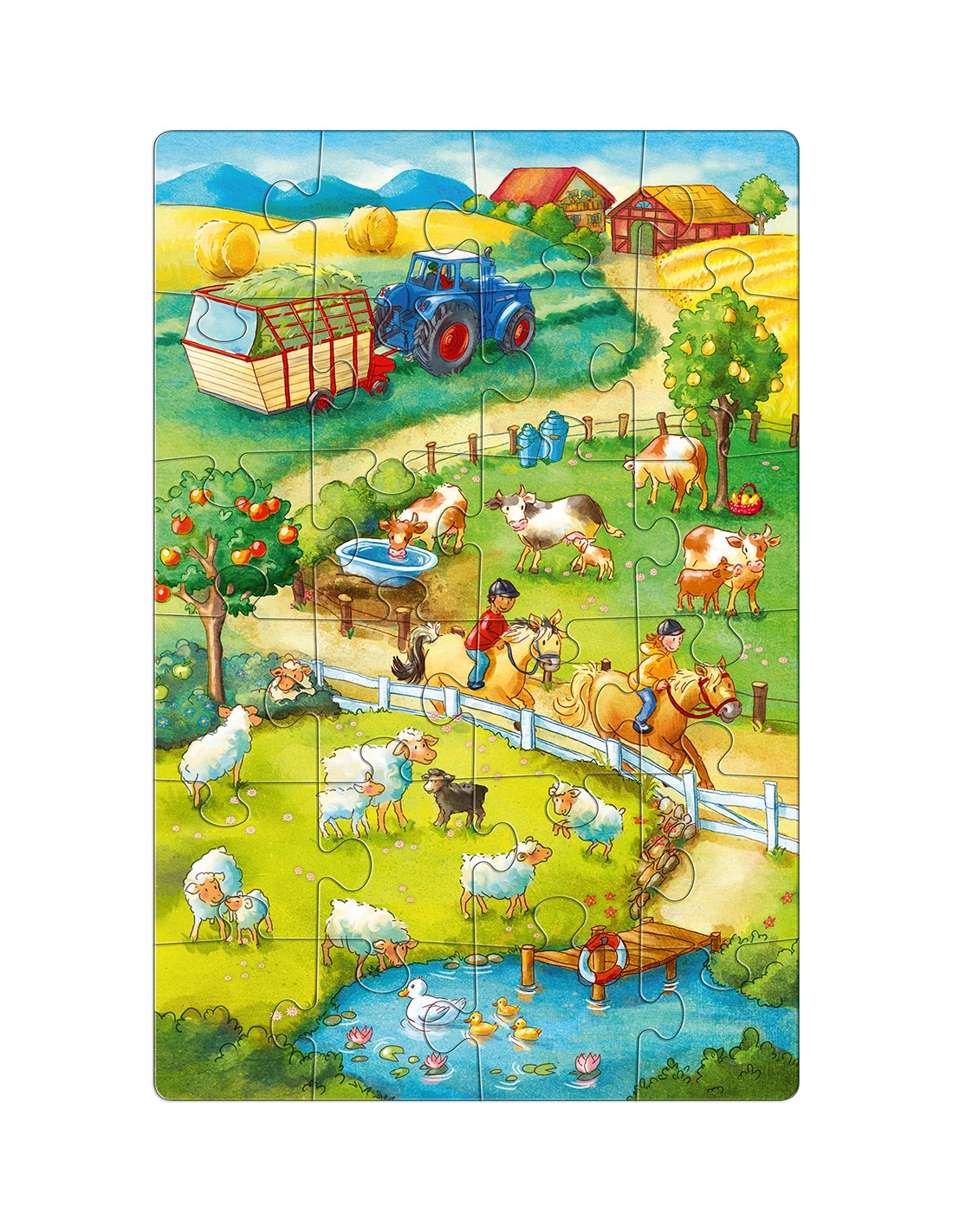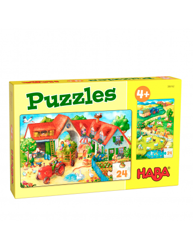 2 puzzles de 24 piezas cada uno con bonitas ilustraciones de una granja y su entorno.
