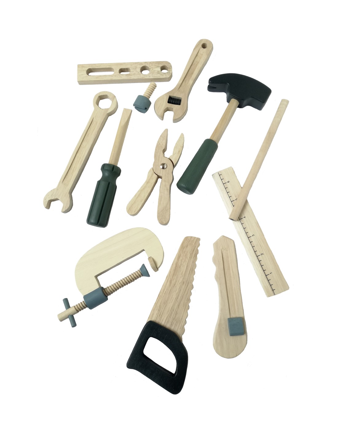 - Contiene un martillo, una sierra, una llave inglesa, un nivel, un cúter, un destornillador, unos alicates, una abrazadera, una llave fija y un tornillo.