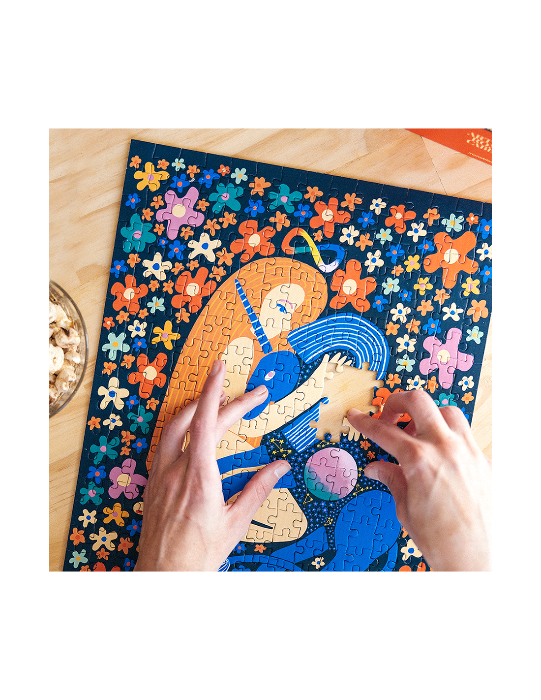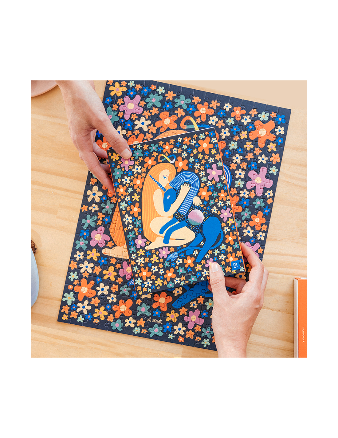 Este puzzle de 300 piezas es una bonita ilustración de la artista Vik Arrieta que una vez terminado se puede enmarcar y colgar de la pared de cualquier estancia.