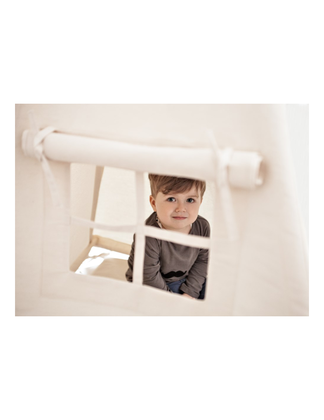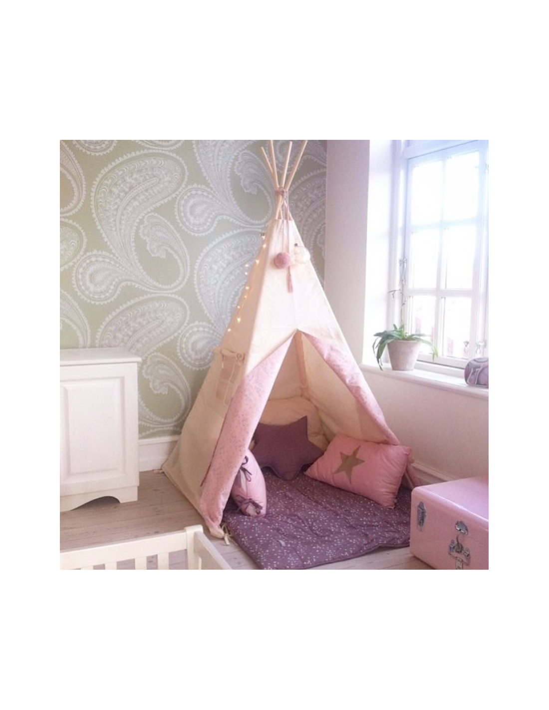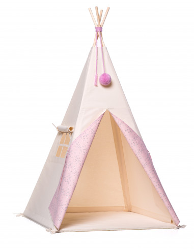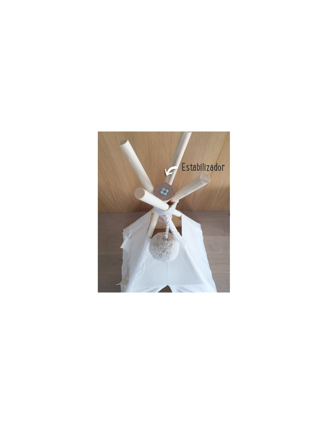 - Incluye una cuerda terminada con un decorativo pompón de lana de color rosa que sirve para atar entre sí las 4 barras de las paredes en la parte superior del tipi.