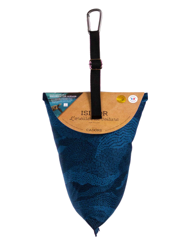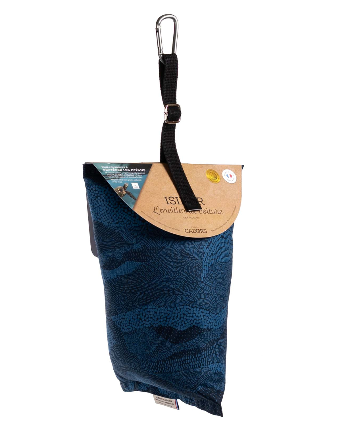 Este cojín para coche está fabricado en Francia por una marca familiar llamada Petits Cadors. Utilizan tejidos orgánicos y fibra de relleno con el sello Ecolabel.