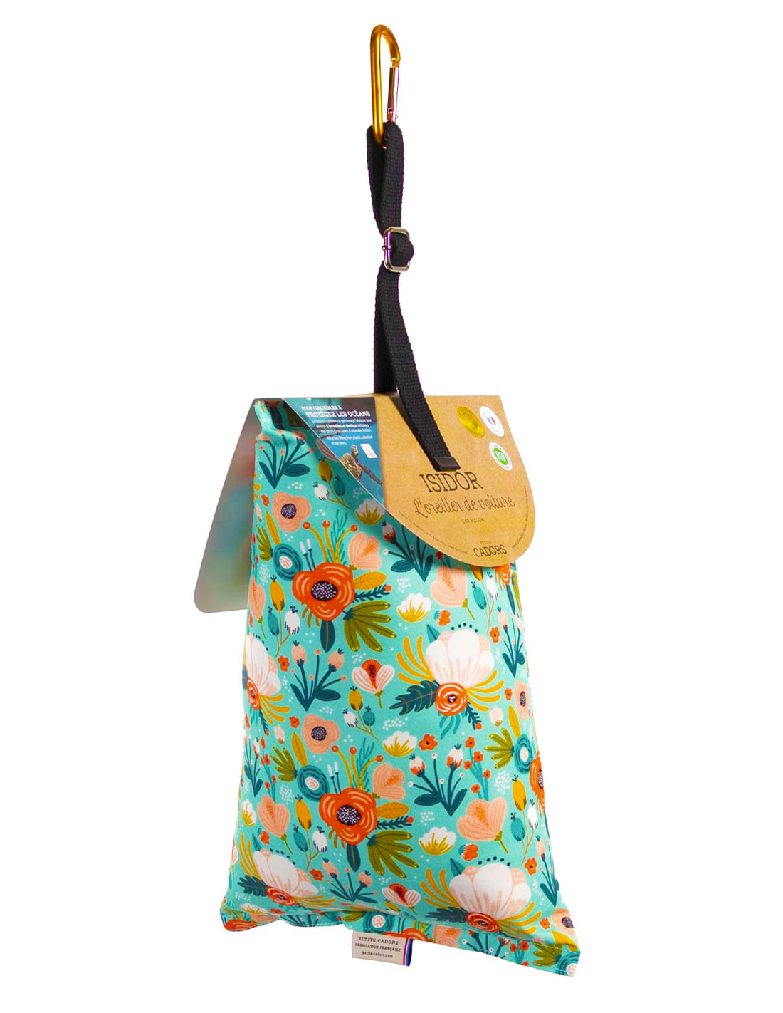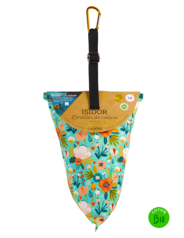 - Se fija al reposacabezas con un mosquetón para que no se mueva.