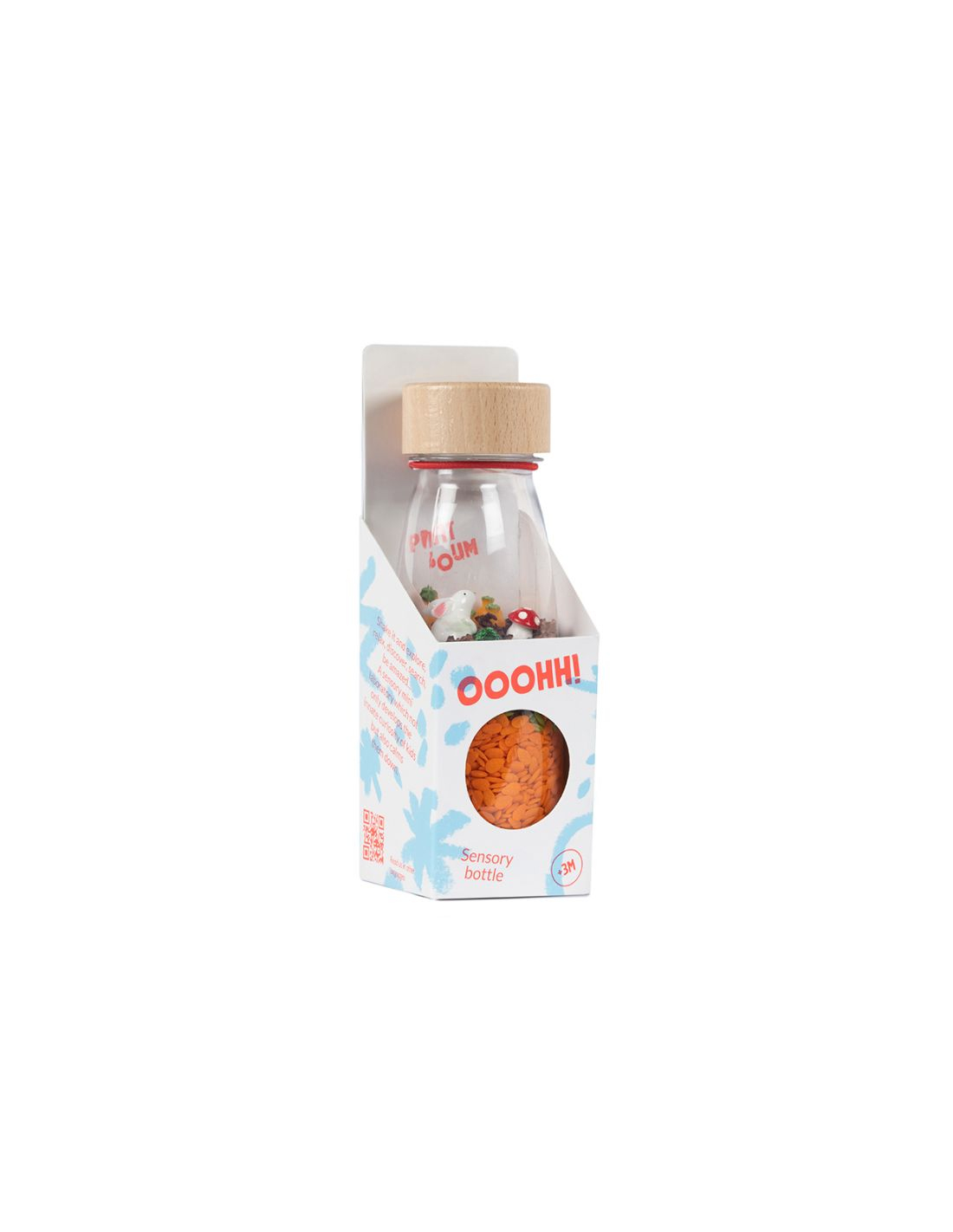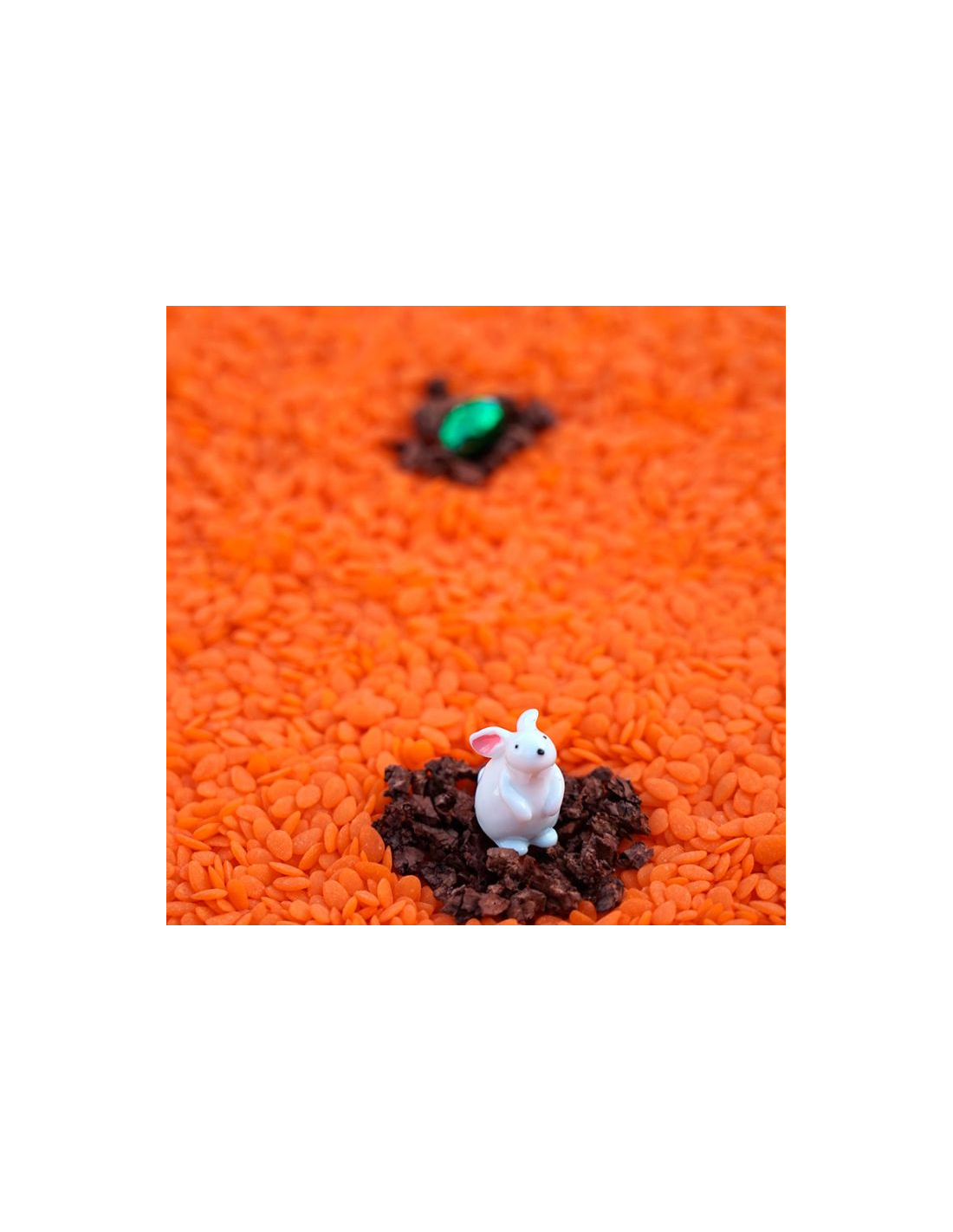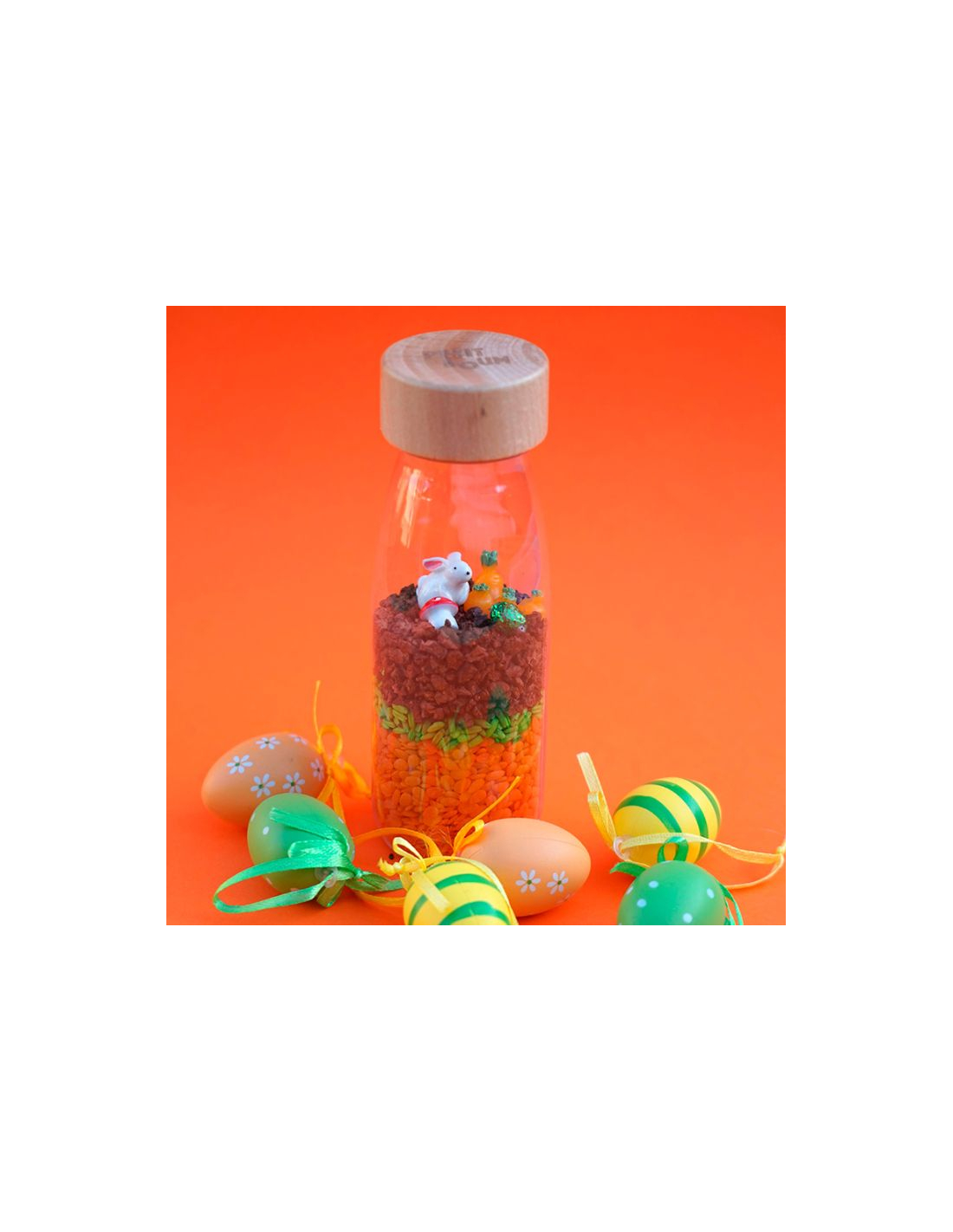 - Botella sensorial llena de piedrecitas naranjas y marrones con diferentes elementos en su interior: un conejito, setas, zanahorias y un huevo de pascua.